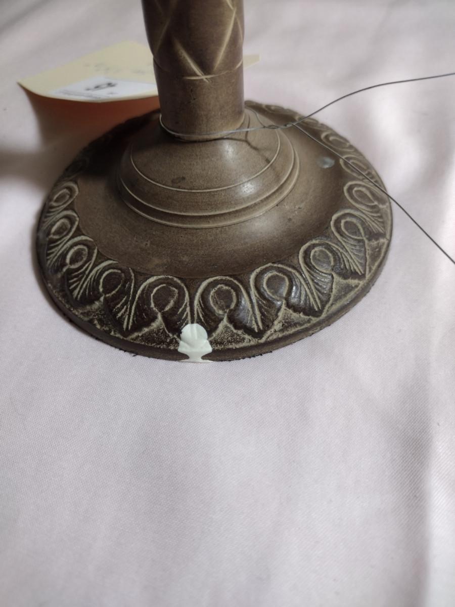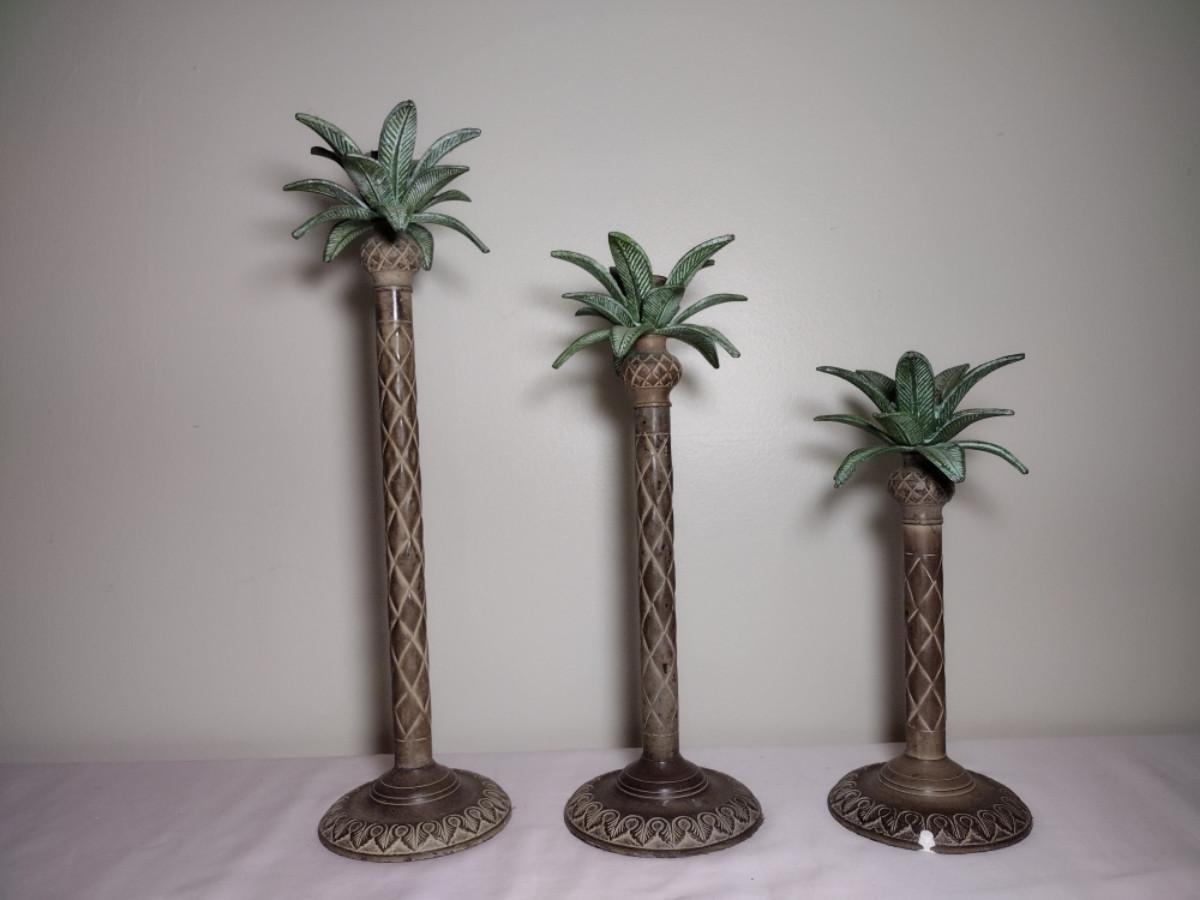 Candle holders are shaped like palm trees and measure 17", 14", and 11" from left to right. The 11" candle holder has a spot of paint on it that needs to be removed.