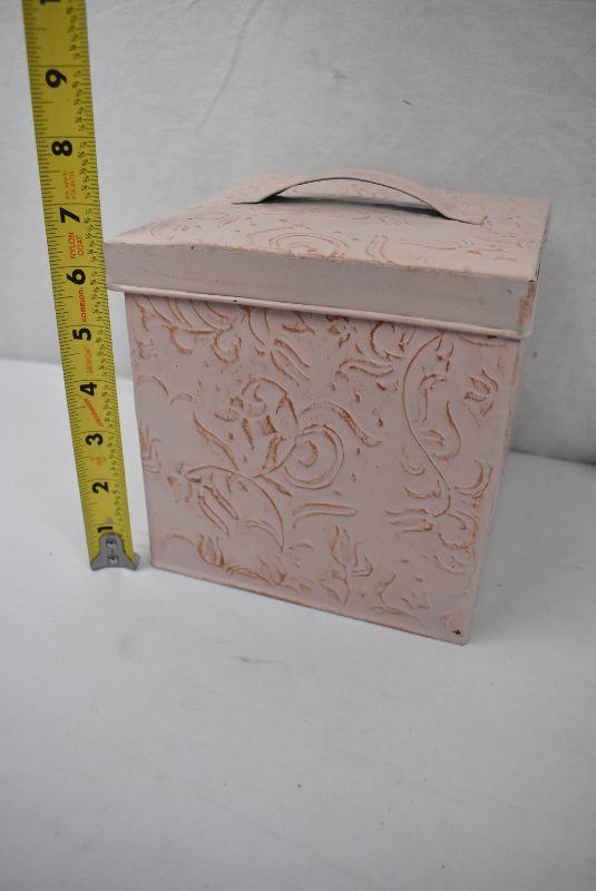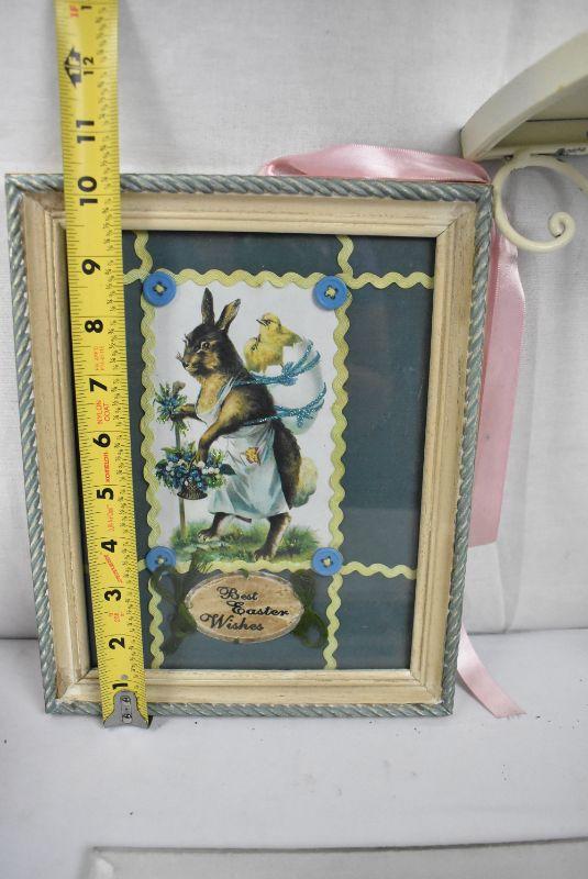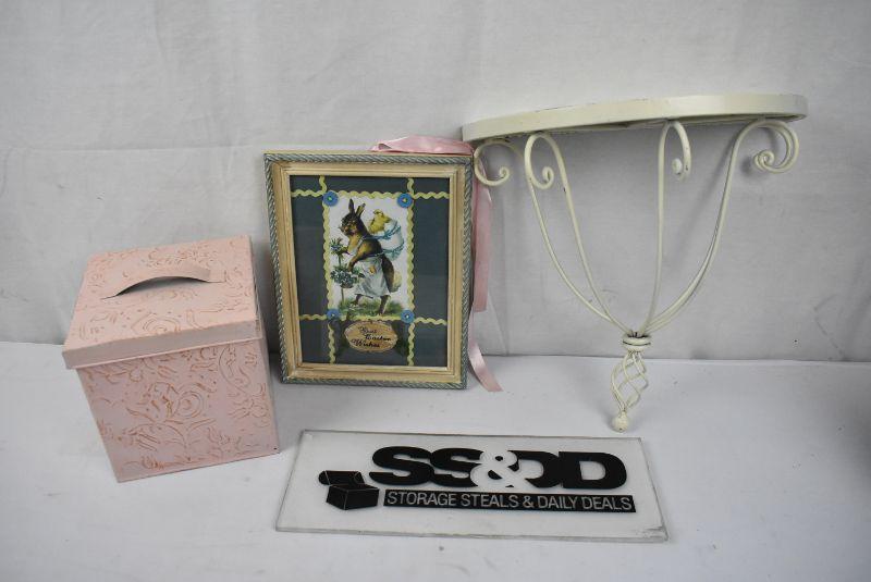 3 pc Antique Style Decor: Pink Metal Box, Framed Easter Image, Metal Wall Shelf