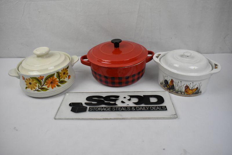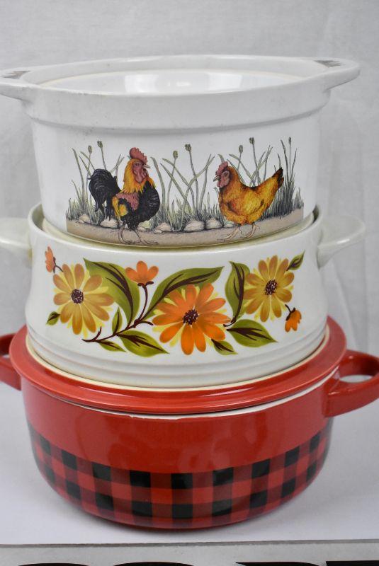 3 pc Bakeware + 3 lids: Roosters, Flowers, Red/Black Plaid