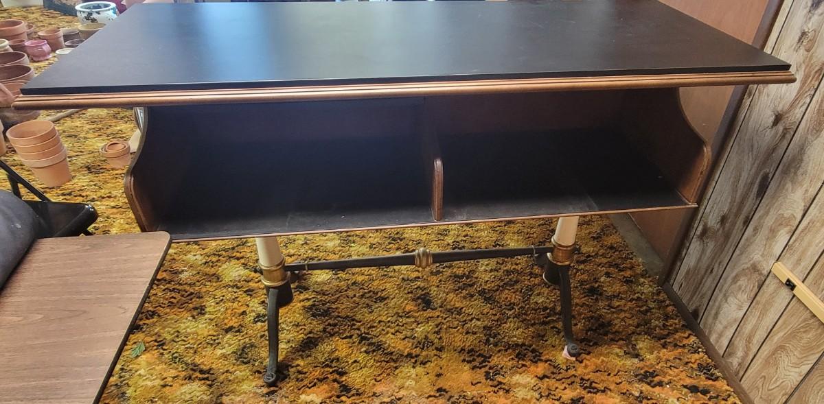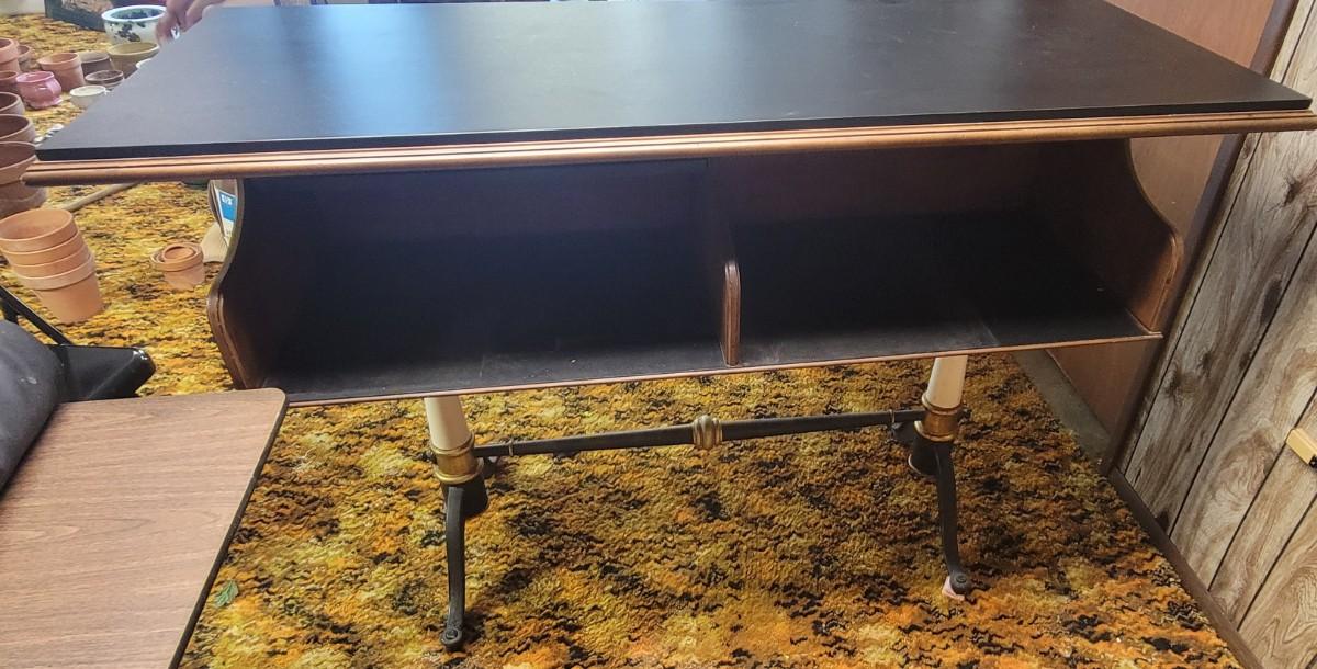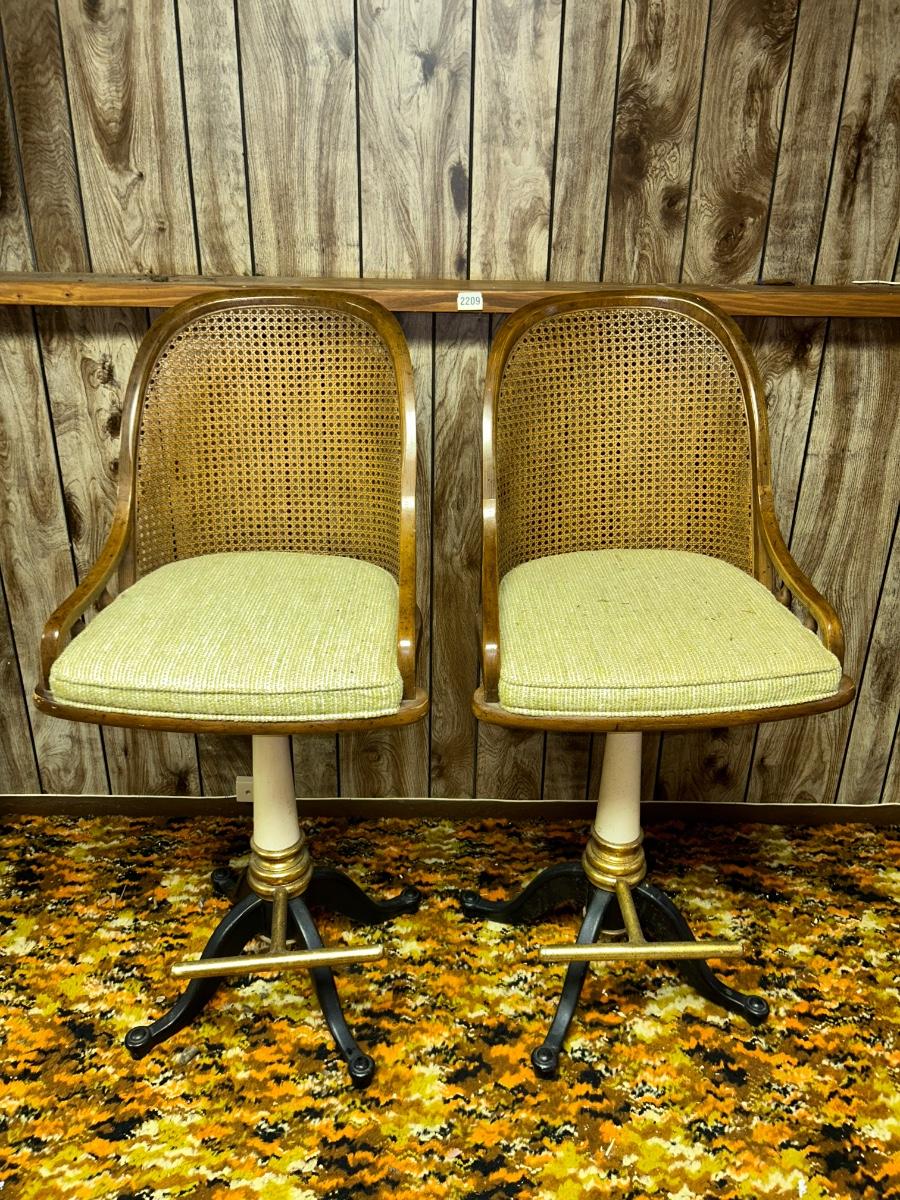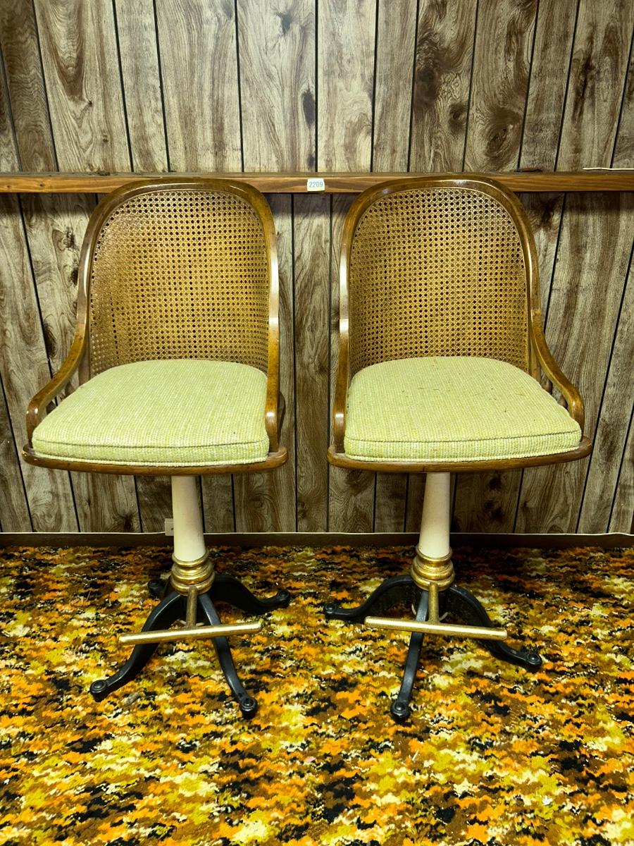 Bar is approx. 48" tall and does have 3 cubbies on the serving side. Vintage, ornate footings and legs. Length is approximated at 60" and width of approximately 32". Will come with two swivel pedestal chairs.