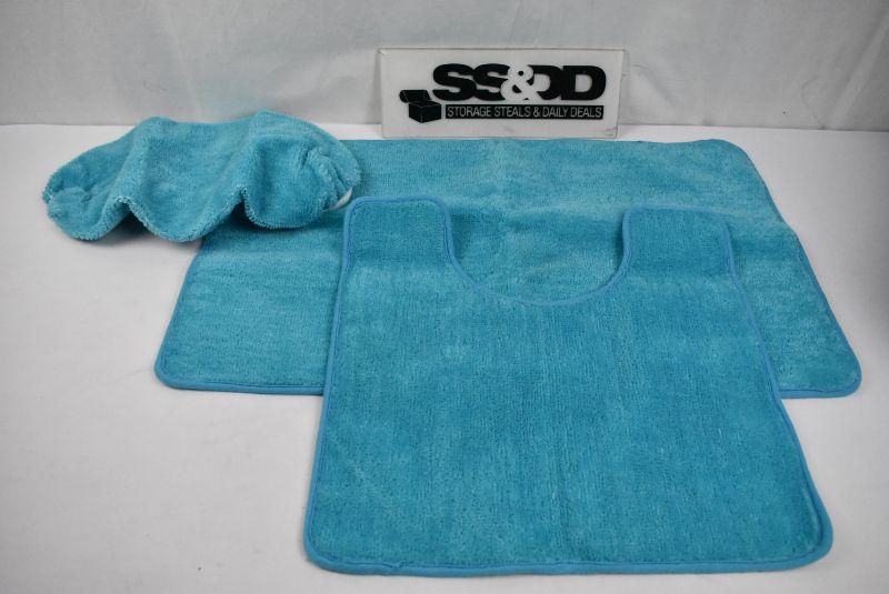 3 pc Bathroom Rugs, Turquoise. Toilet lid cover, contour rug, and 18"x29" rug. No tags - New