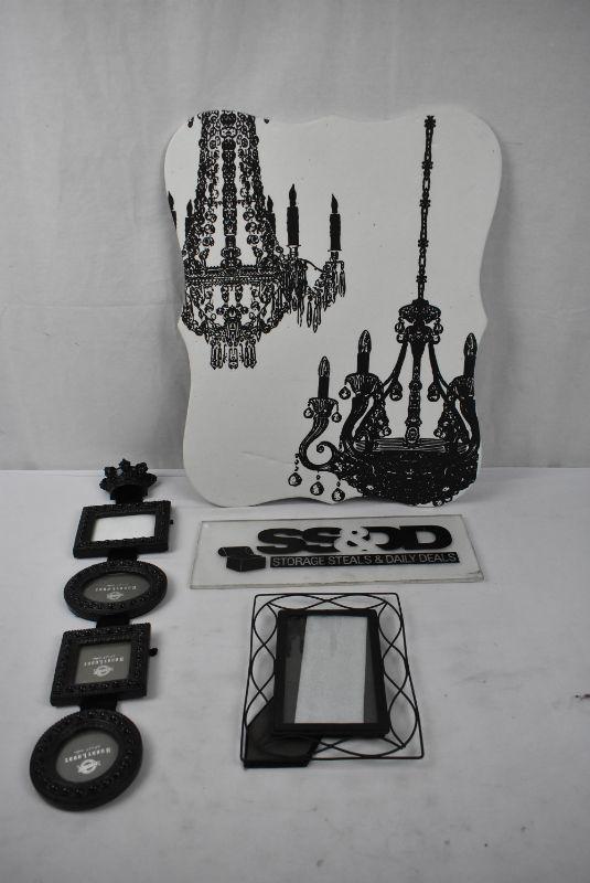 3 pc B&W Wall Decor: Chandelier Wall Corkboard, 4 small attached frames with crown, One 4x6 Metal Frame