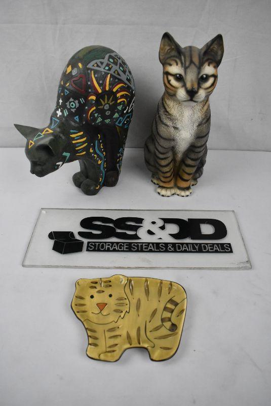 3 pc Cat Decor: 2 Statues & 1 trinket dish