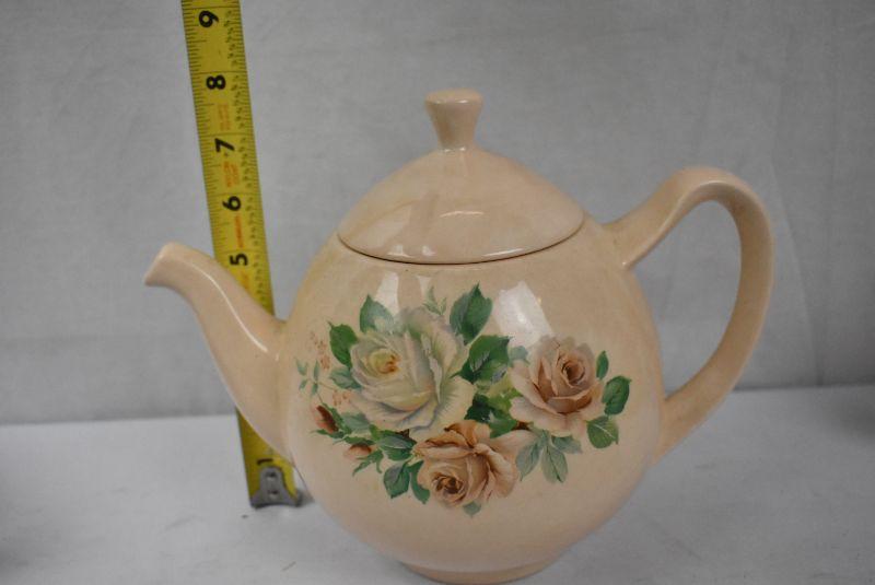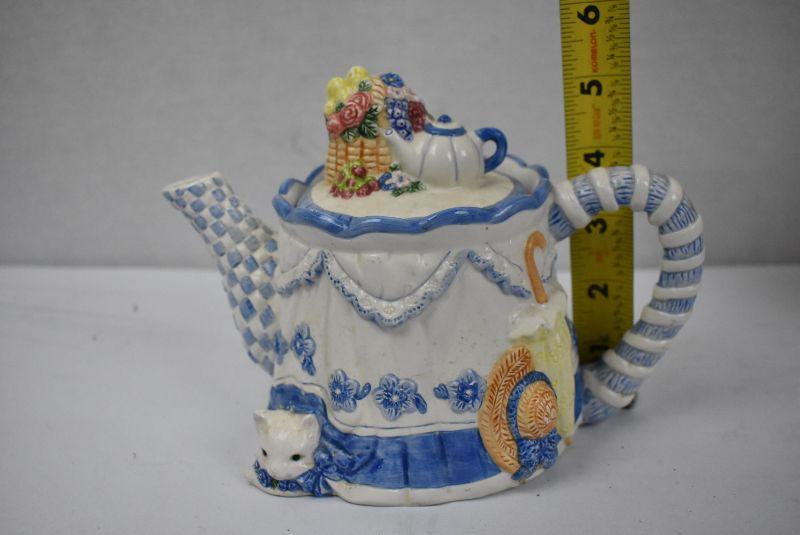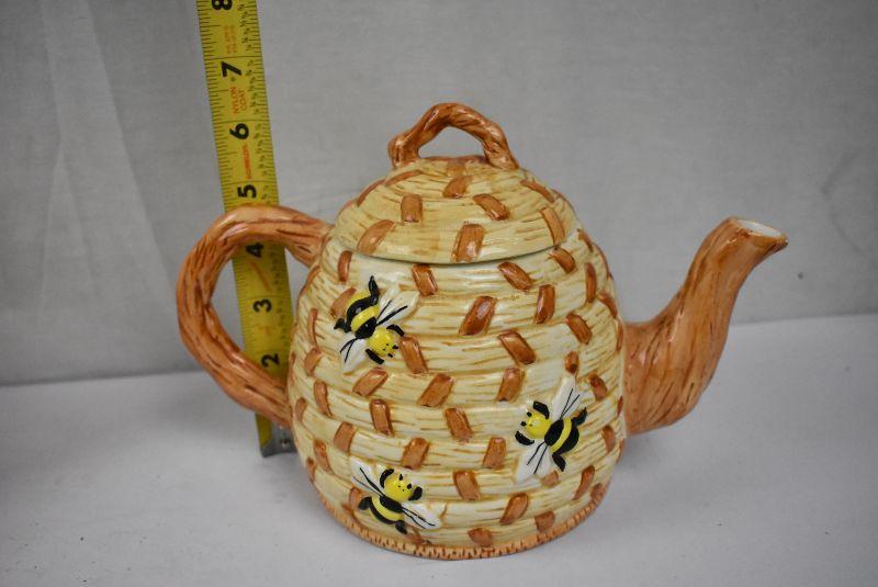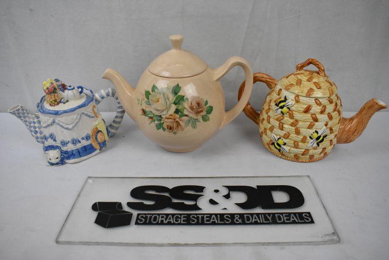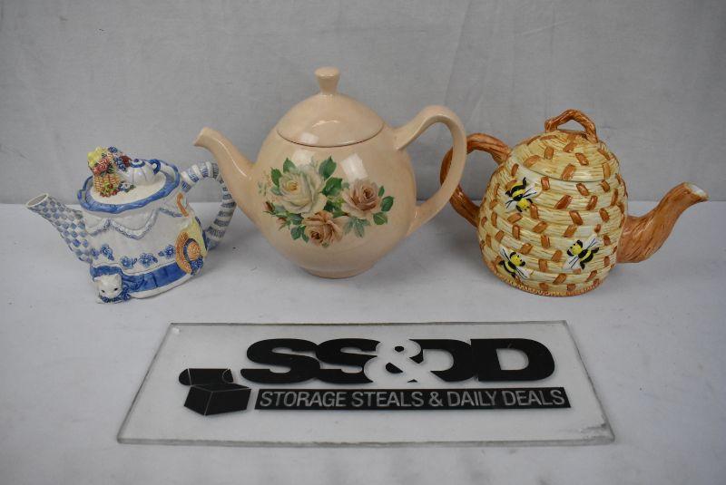 3 pc Ceramic Teapots: Blue/White, Peach Floral, Bees