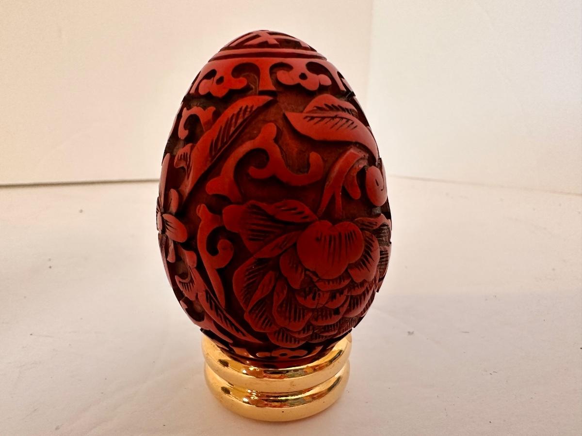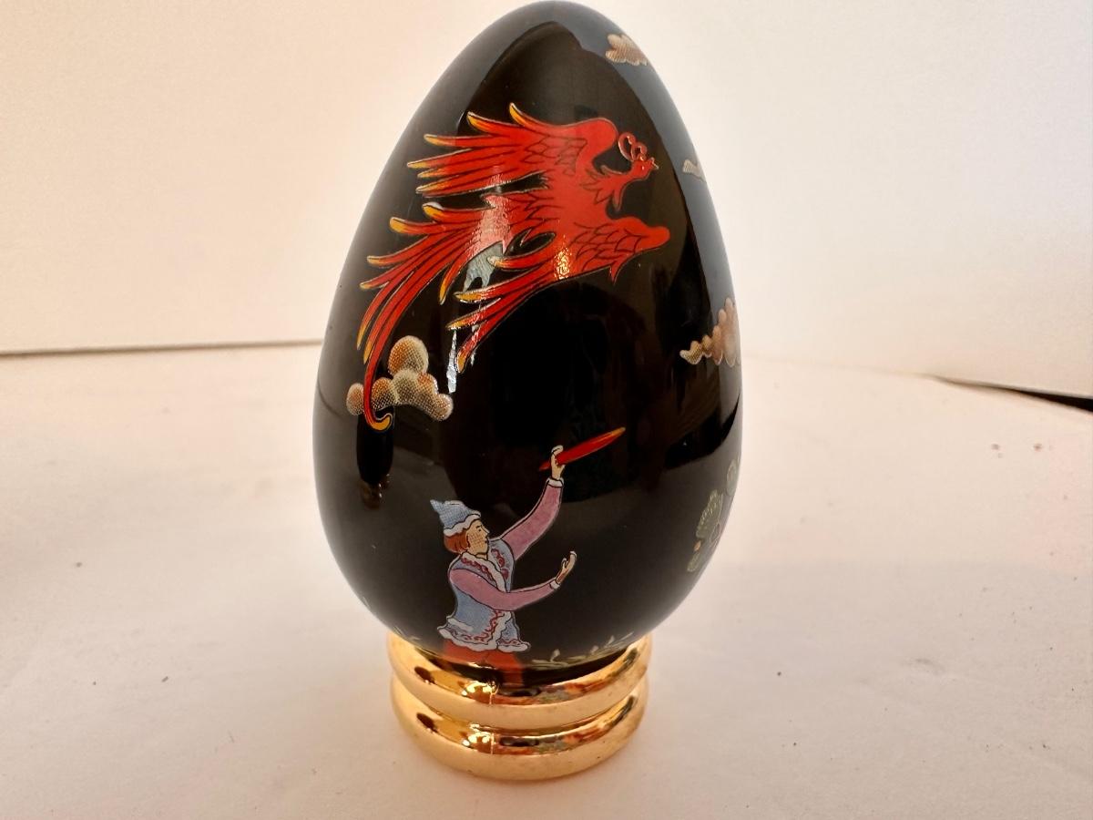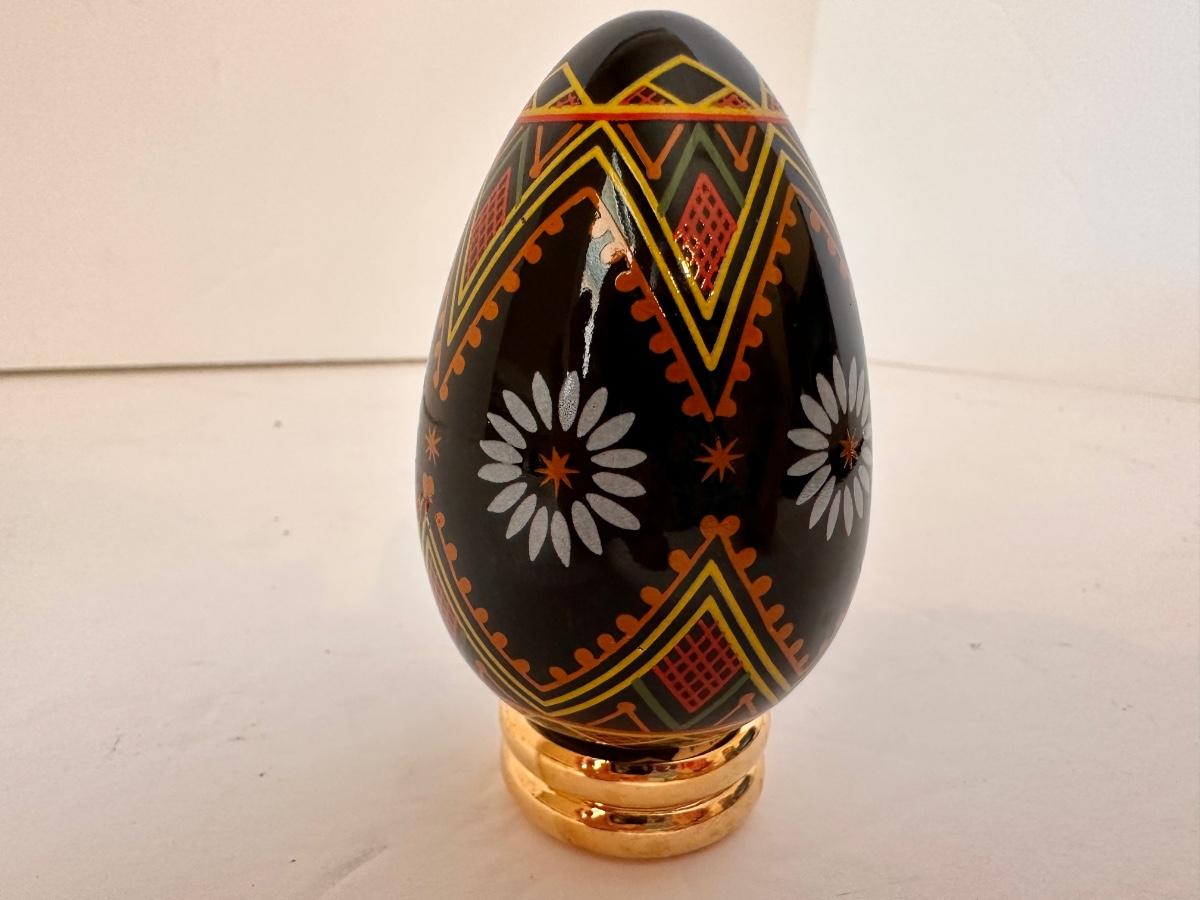 3 PC COLLECTIBLE EGG LOT, CARVED CINNABAR, BLACK JAPANESE ART, BLACK GEOMETRIC ART EGGS AS PICTURED