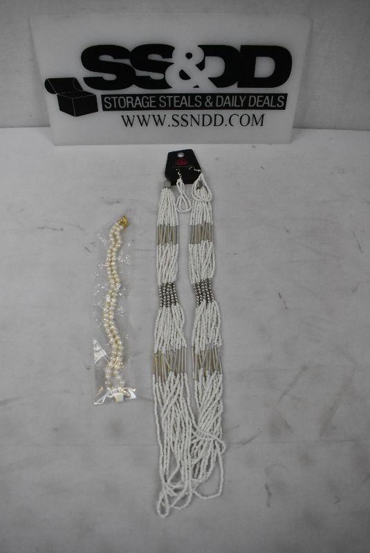 3 pc Costume Jewelry: White Bead Necklace/Earrings & Faux Pearls Necklace - New
