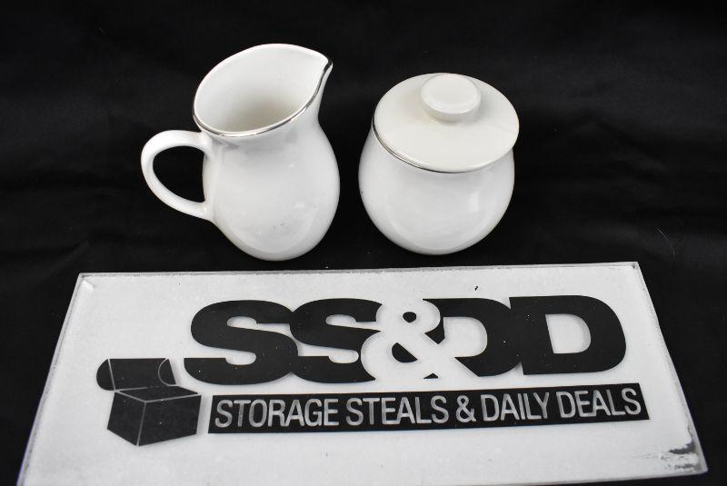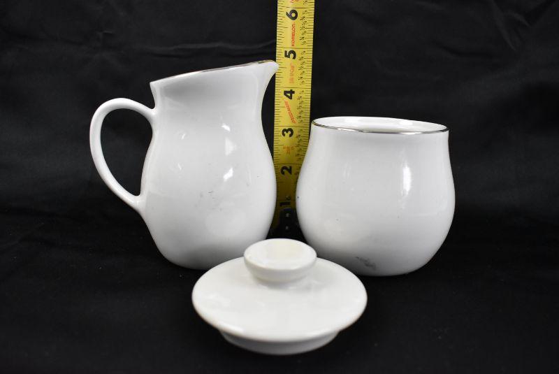 3 pc Cream & Sugar (with lid) Dishes by Corning Centura. White with Silver Trim