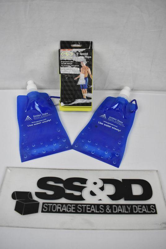 3 pc Exercise/Outdoors: 9' Speed Jump Rope & 2 Collapsible Water Bags with Carabiners, 18 oz each - New