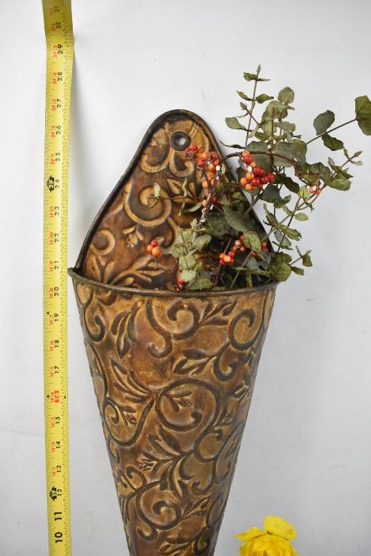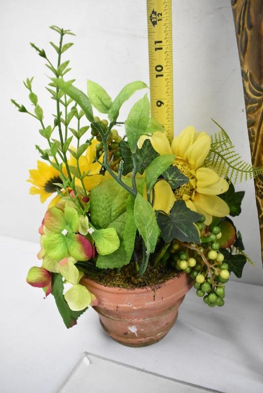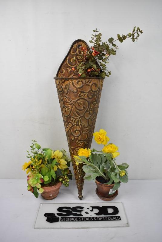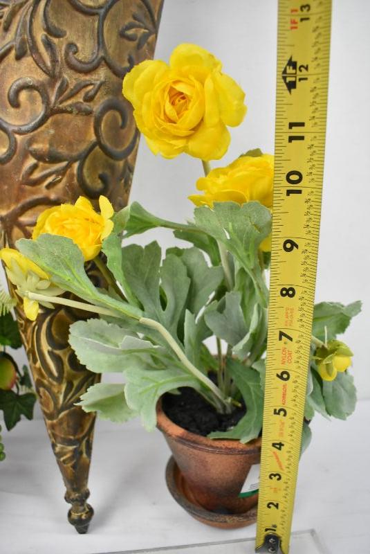 3 pc Faux Floral Decor: 1 Triangular Wall Decor, 2 small pots
