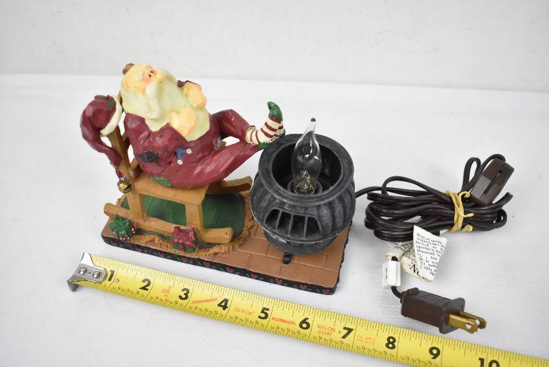 3 pc Holiday Decor: Box Penguin, Box Bear, Santa Figurine warming feet by the fire - Works