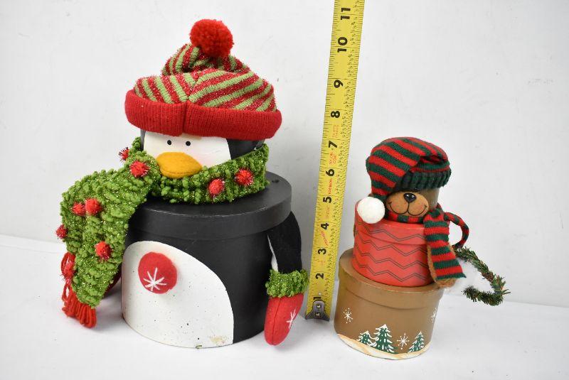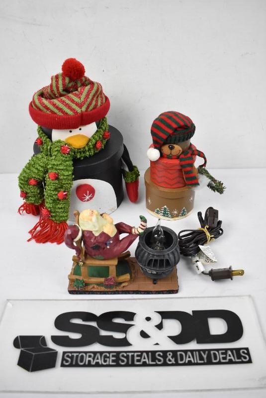 3 pc Holiday Decor: Box Penguin & Bear, Santa warming feet by the fire - Works