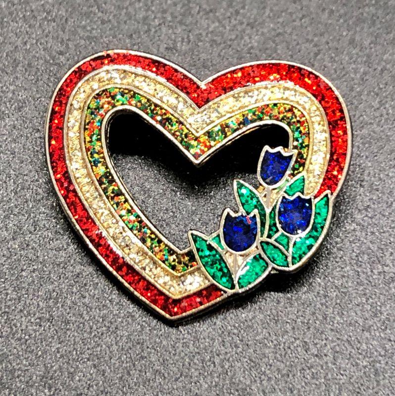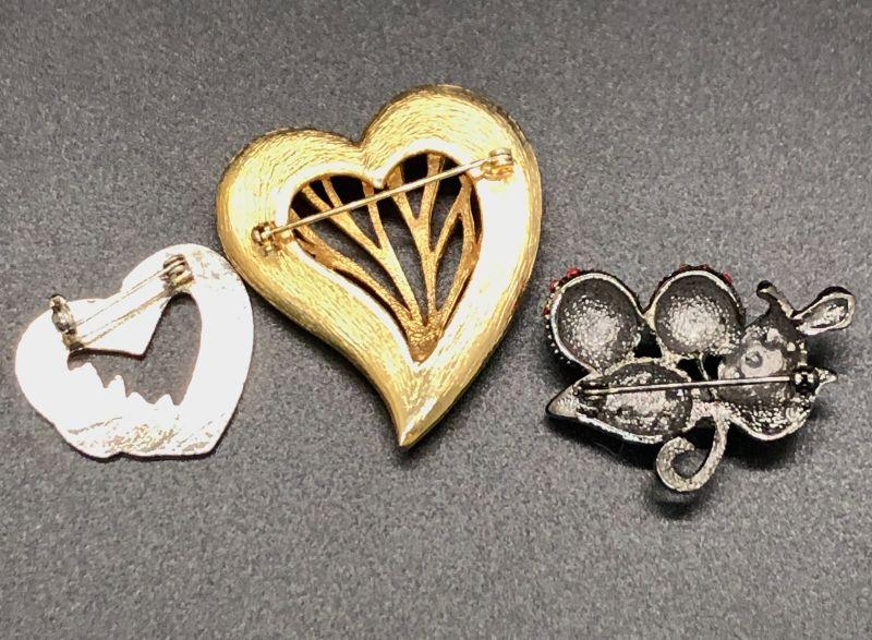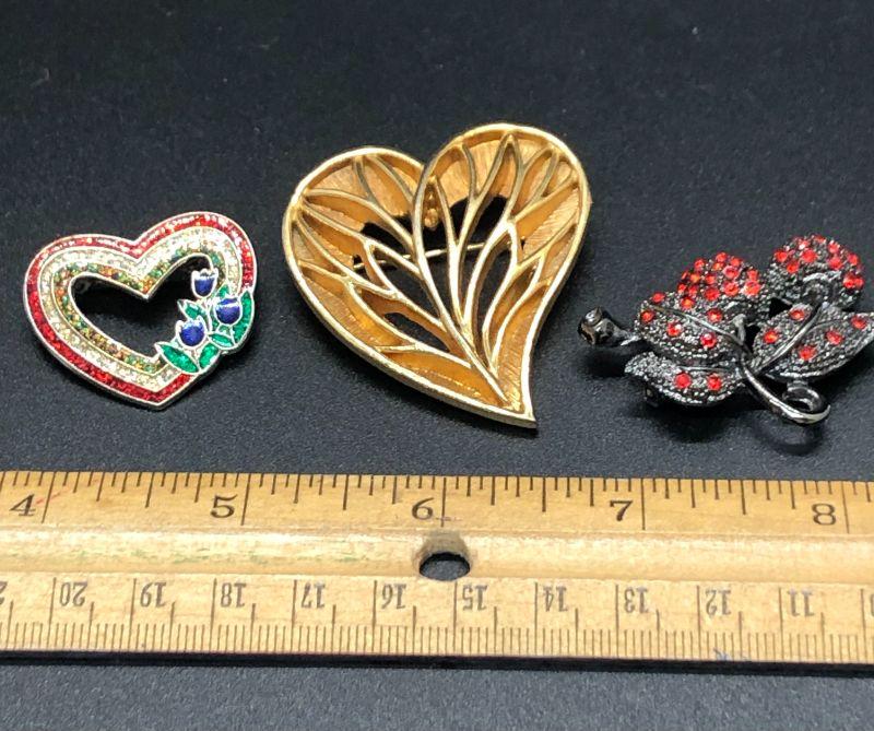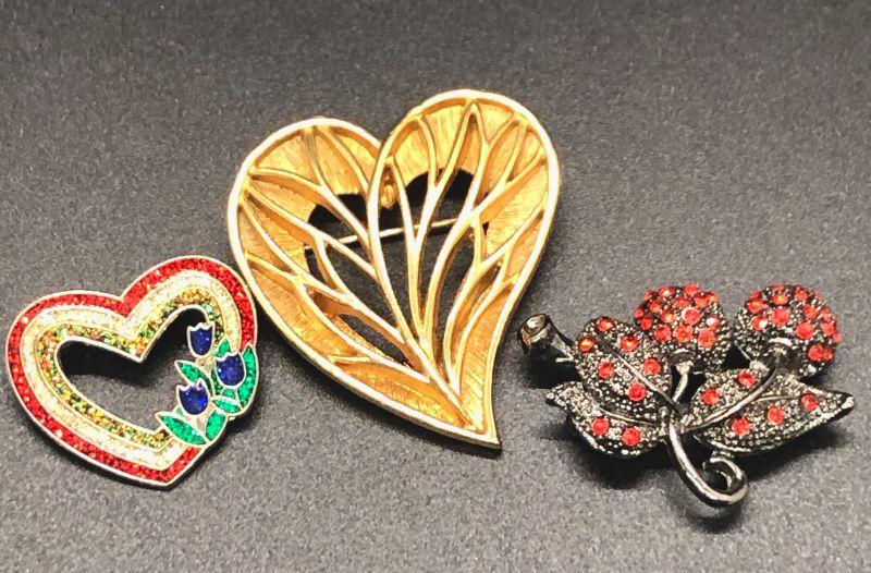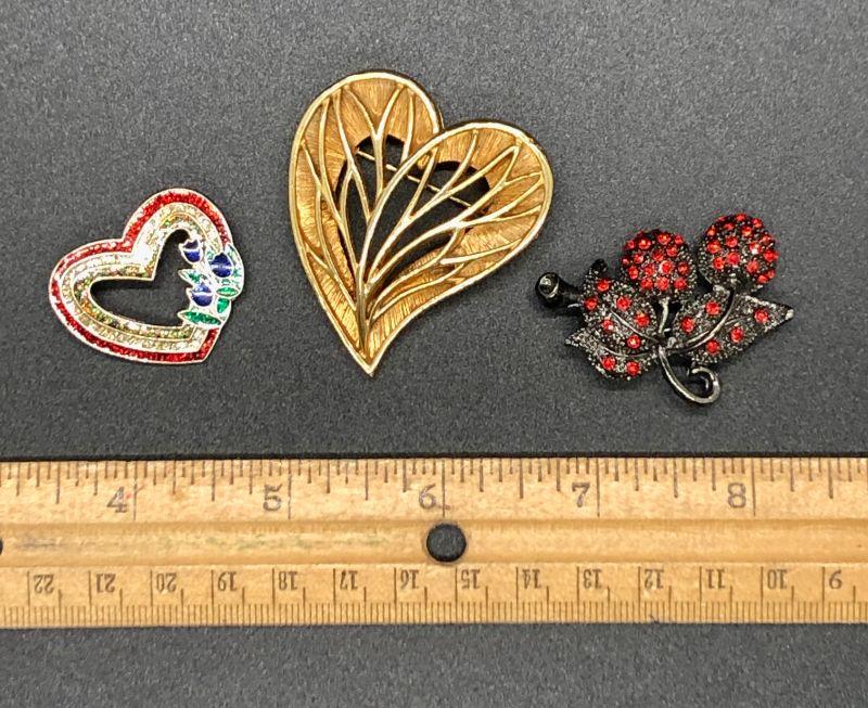 3 pc Jewelry Lot, pin / brooch, hearts and flowers