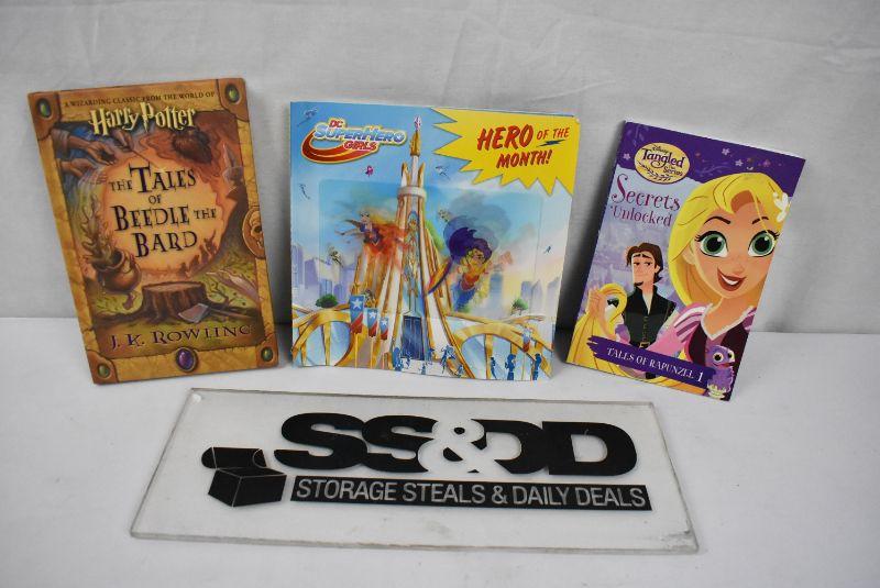3 pc Kids Fiction Books: Beedle the Bard, DC Super Hero Girls, Tangled Secrets Unlocked