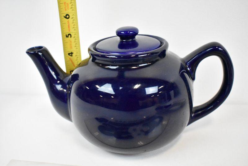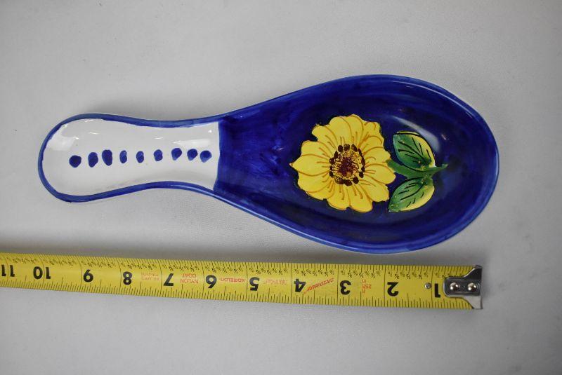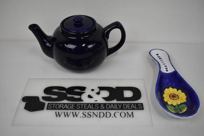 3 pc Kitchen Ceramics: Blue Tea Pot & Spoonrest, Sunflower & Blue
