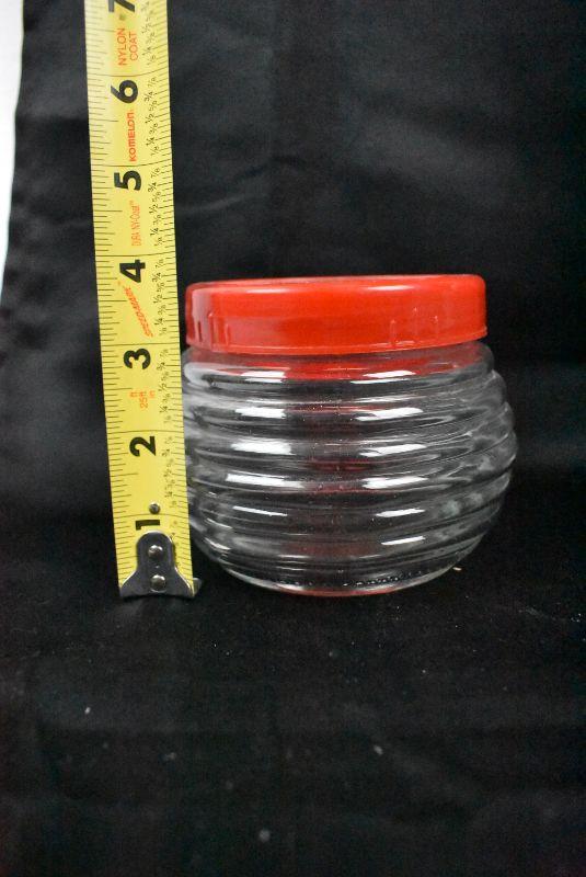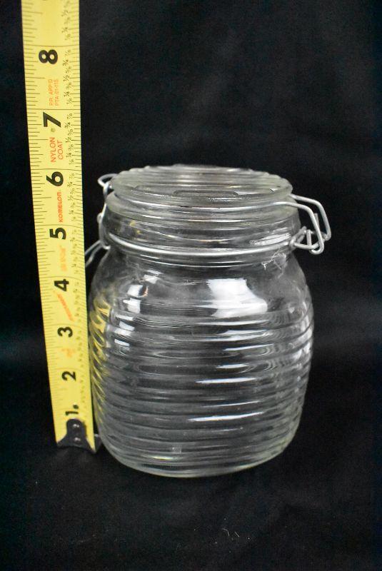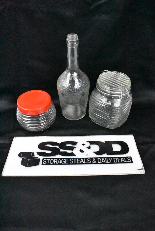 3 pc Kitchen Glass: "striped/beehive" Canisters. Glass bottle w/ Stars