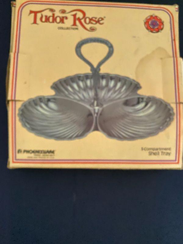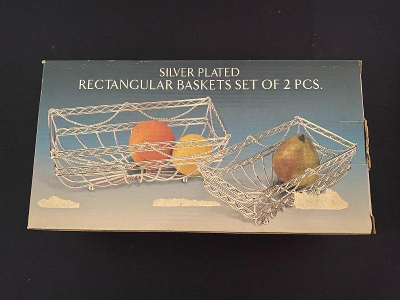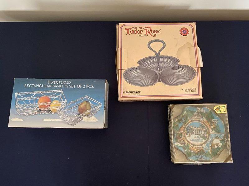 Carawinds Tray, 3 pc - 3 compartment shell tray, silver plate rectangle basket set, new in boxes