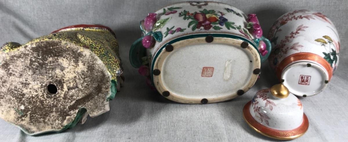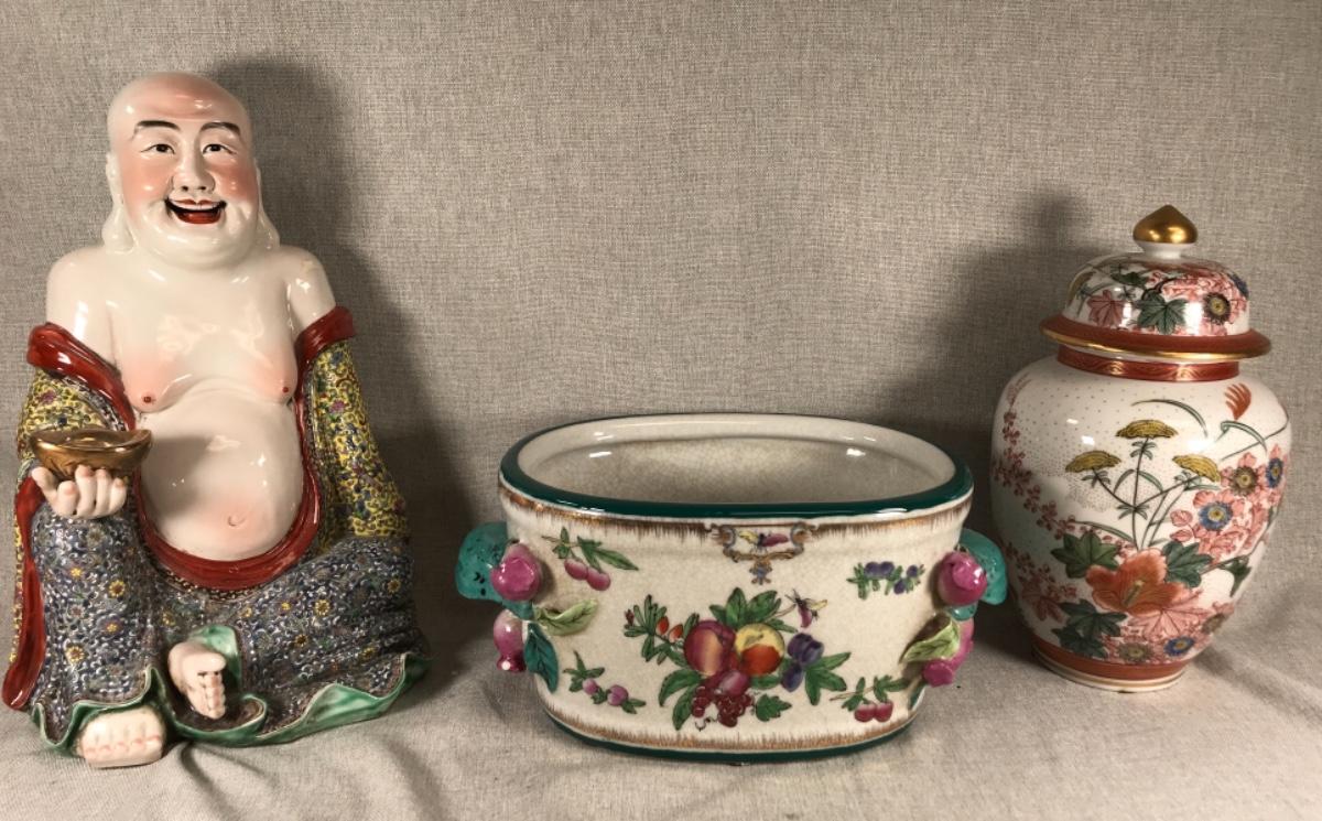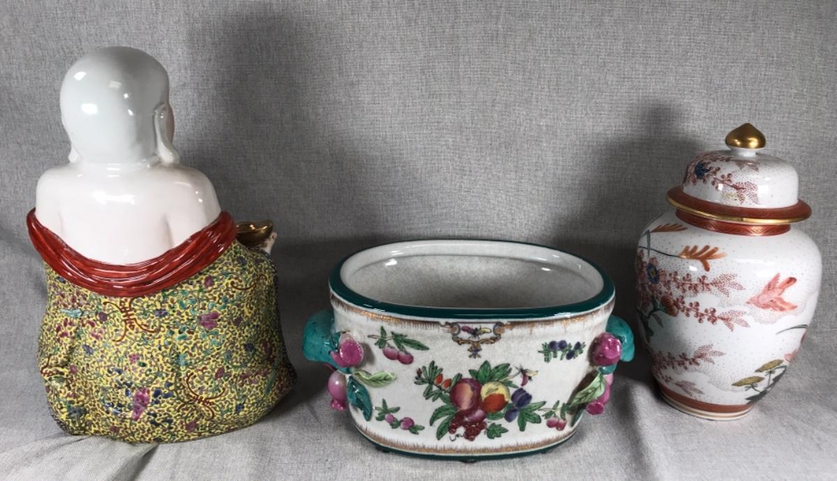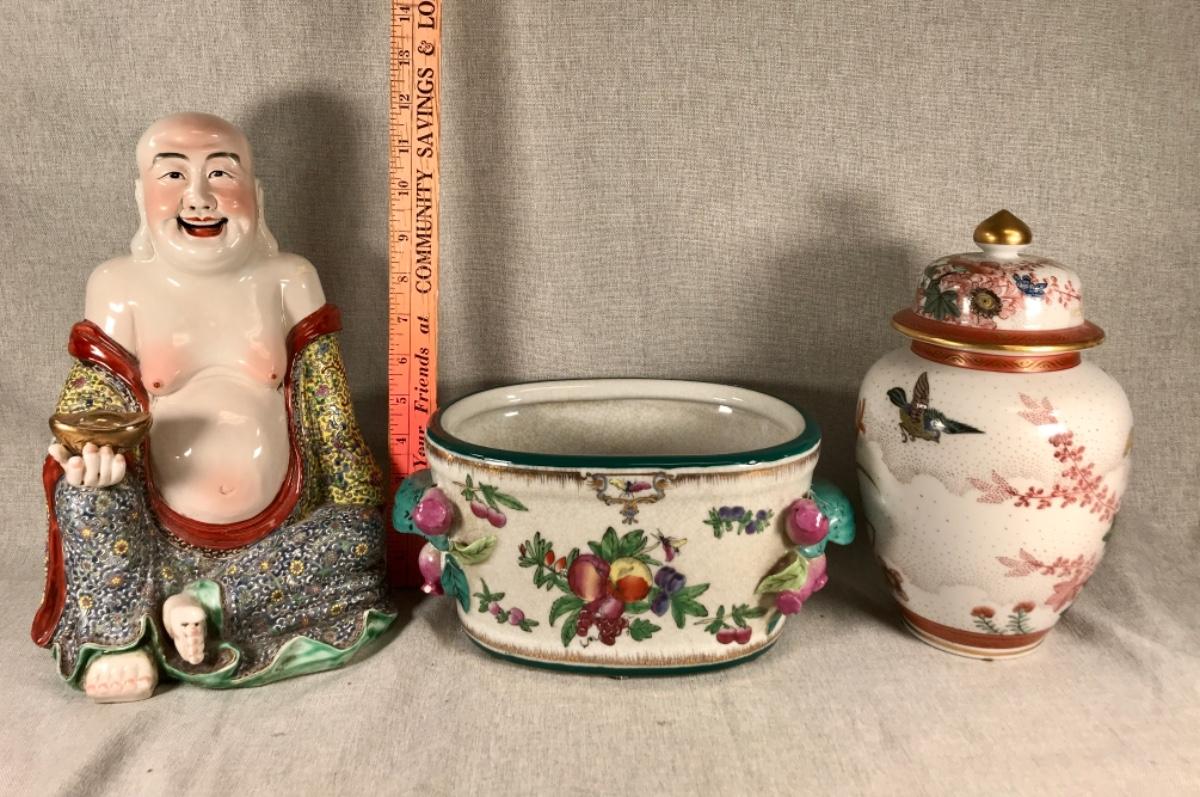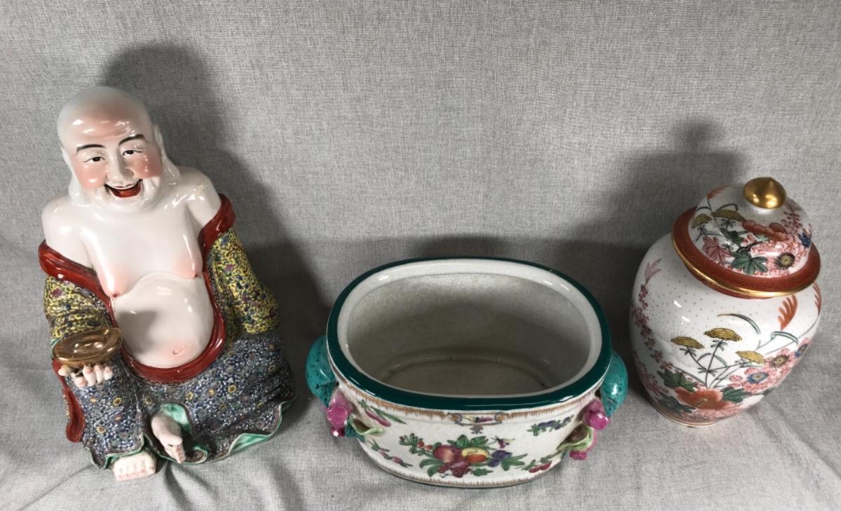 3 pc lot - ceramic Asian Chinoiserie decor, pot, statue, ginger jar