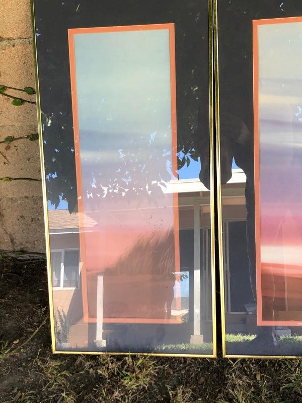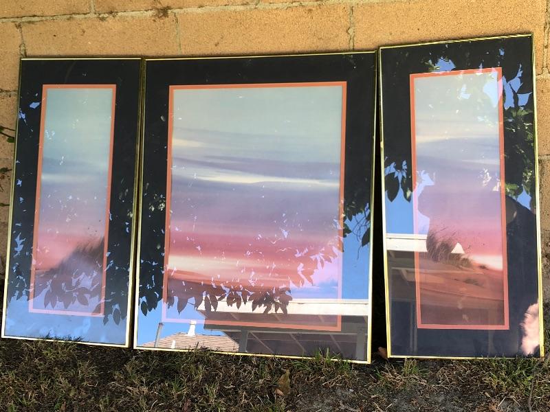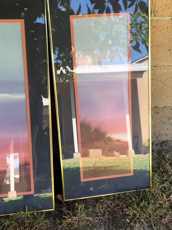 3 pc lot, framed vintage prints of mountain sunset, brass frame, pinks blues 70's era