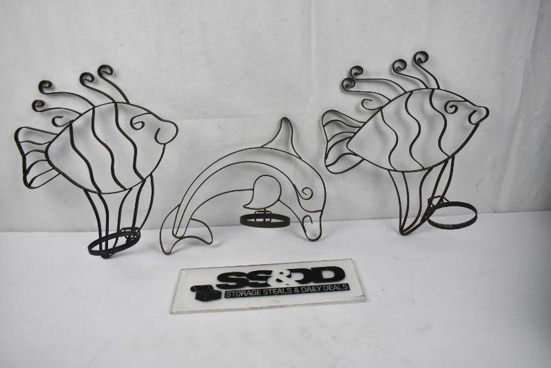 3 pc Metal Outdoor Wall Decor. 2 Fish 1 Dolphin Candle Holders