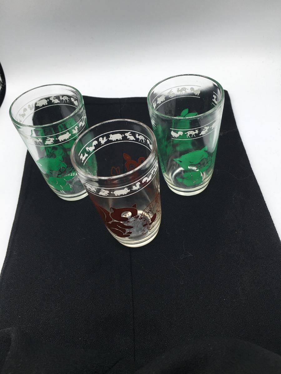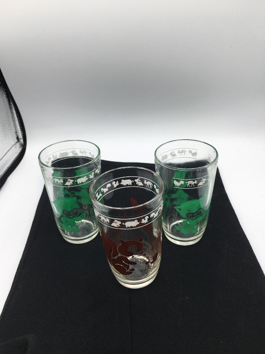 3pc. Swanky juice glasses Mid-Century two green ones have cats and bunny design, one brown one have deer and squirrel design. Strong colors no chips or scratches.