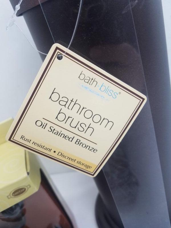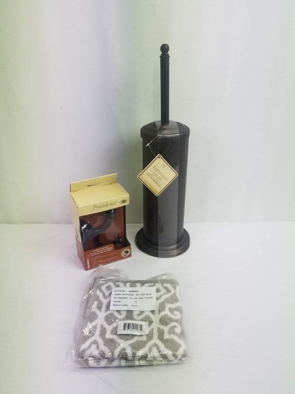 3 pc Misc Bathroom Items: Toilet Brush "Bronze" Double Robe Hook "Bronze" & Washcloth Taupe - New