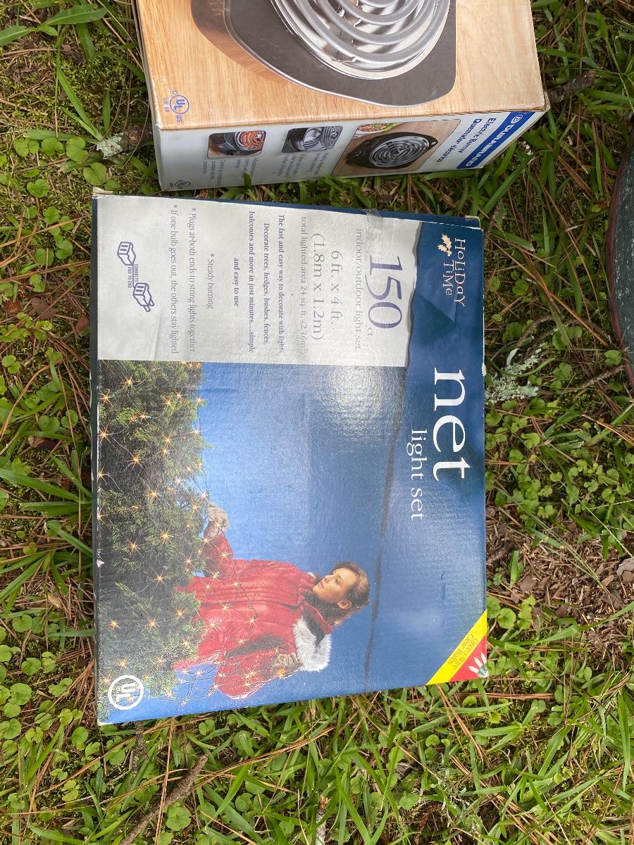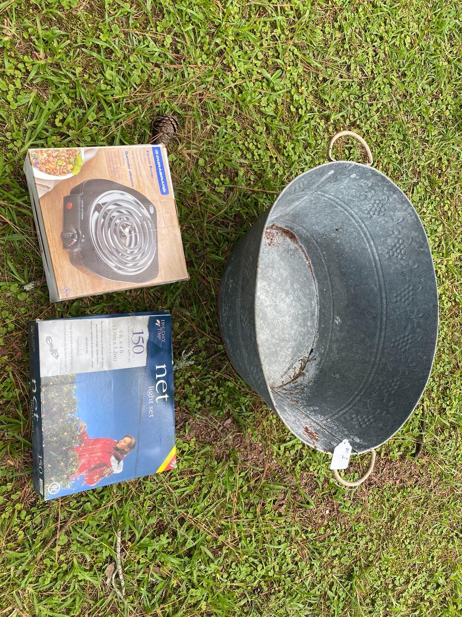 Semi Rusty Galvanized Tub, 150 Light Set Christmas Net, Durabrand Electric Burner