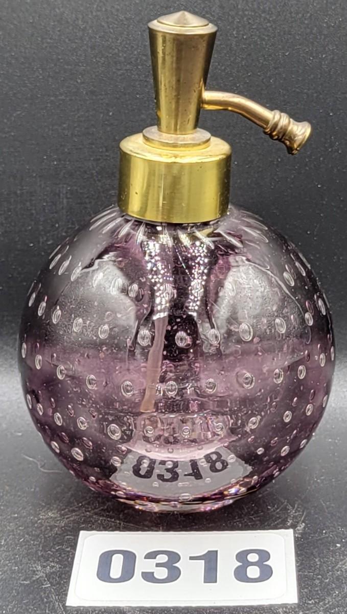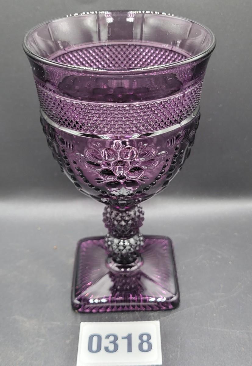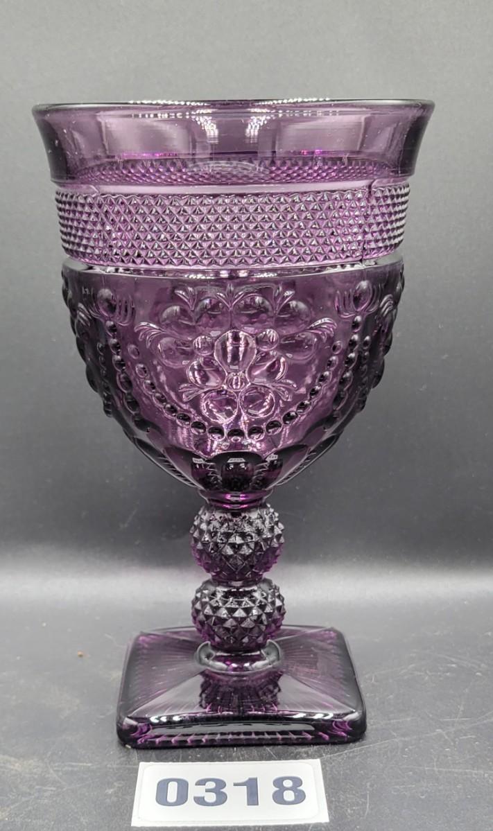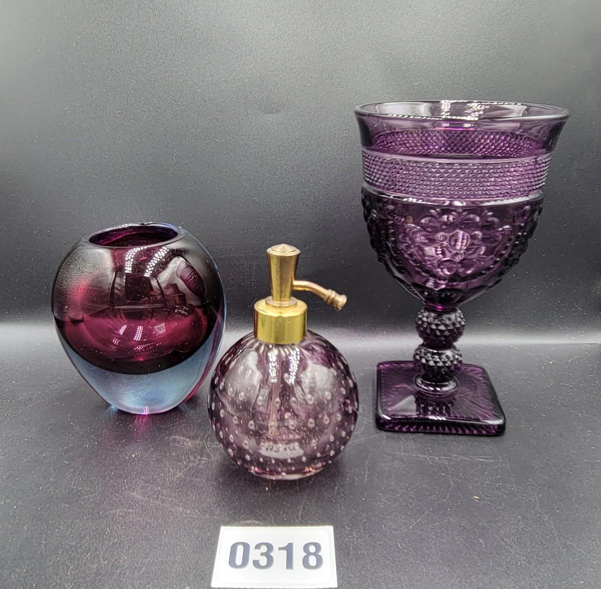 Murano Glass Orb, Imperial Amethyst (King's Crown) wine goblet, and lotion dispenser