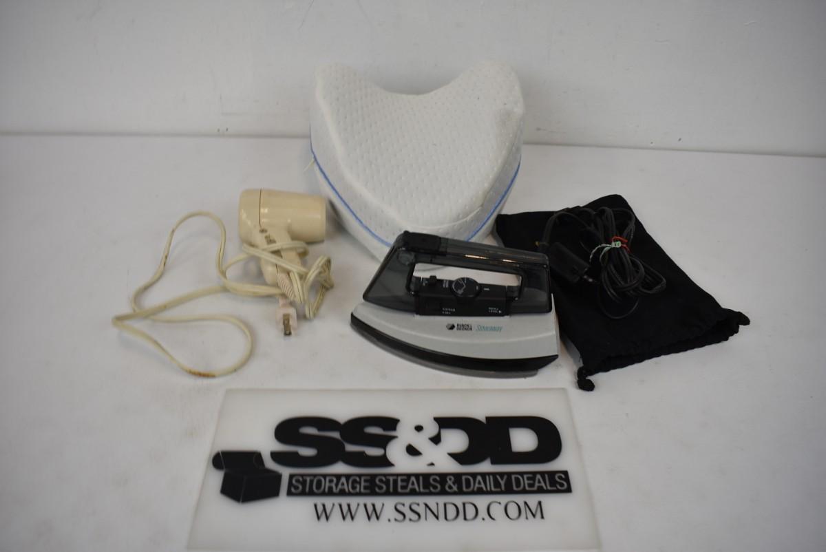 3 pc Personal Care Travel: Small Pillow, Small Folding Iron, Small Hair Dryer