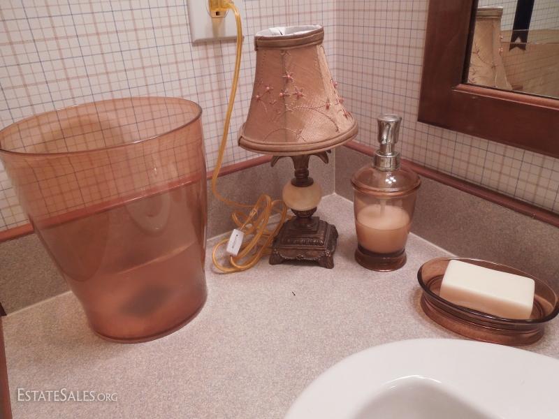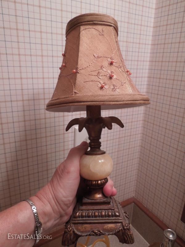 Small silk embroidered shade coordinates with small lucite waste basket, soap dispenser and soap dish. Made by Mainstay. Lamp has "alabaster" orb.