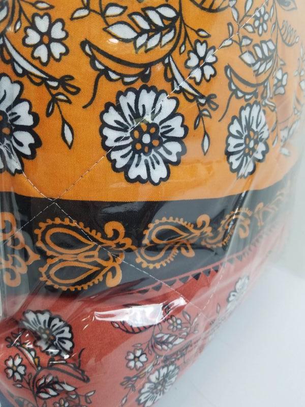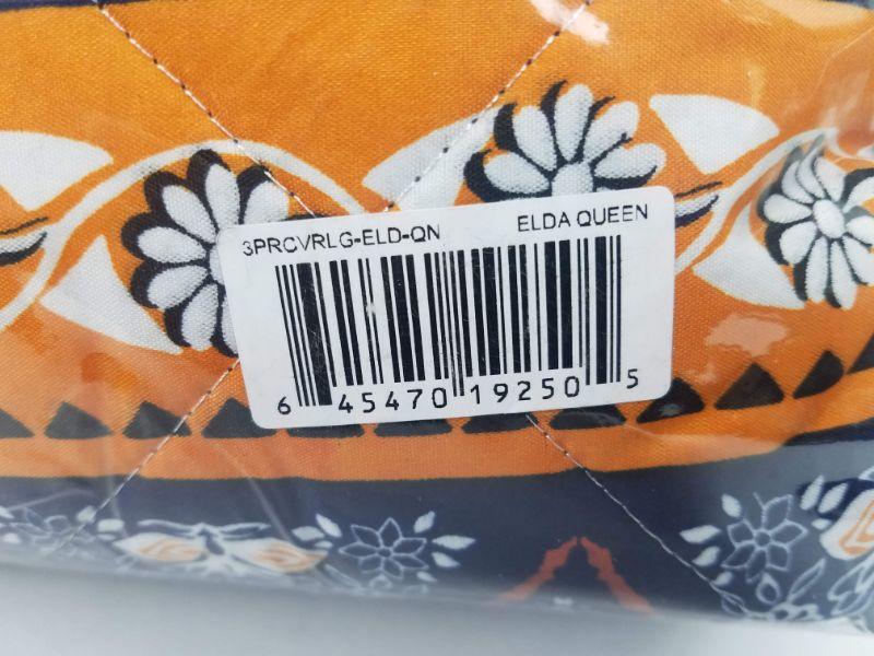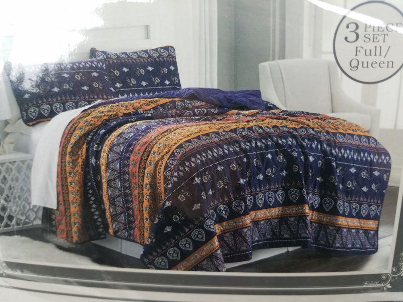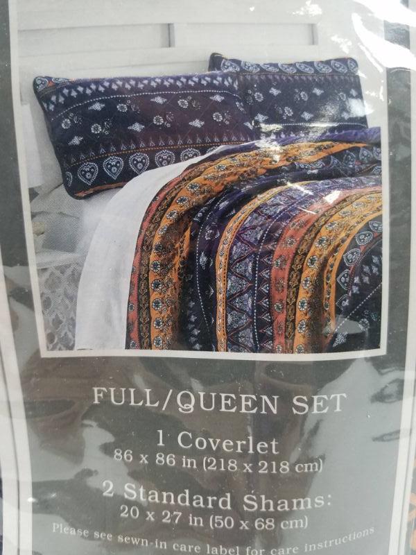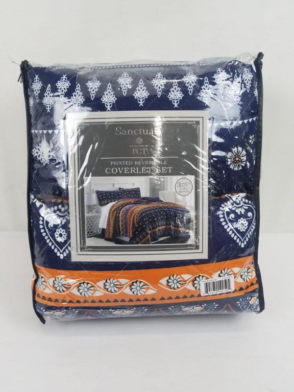 3 pc Printed Reversible Coverlet Set, Size Full/Queen, Oranges & Navy - New