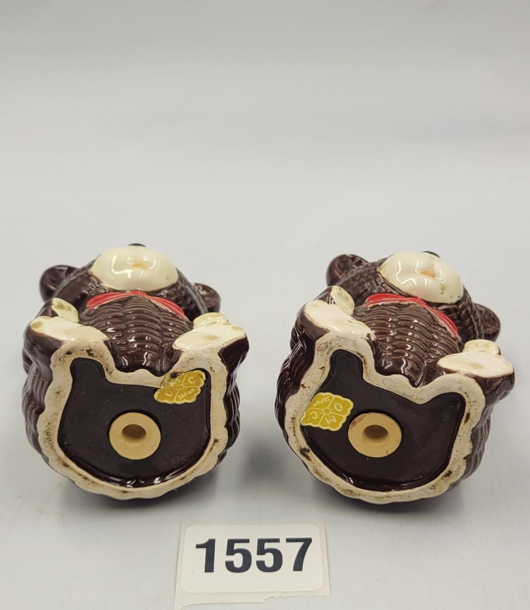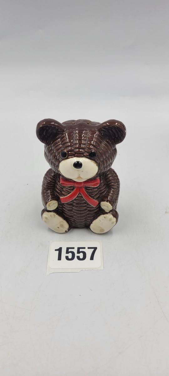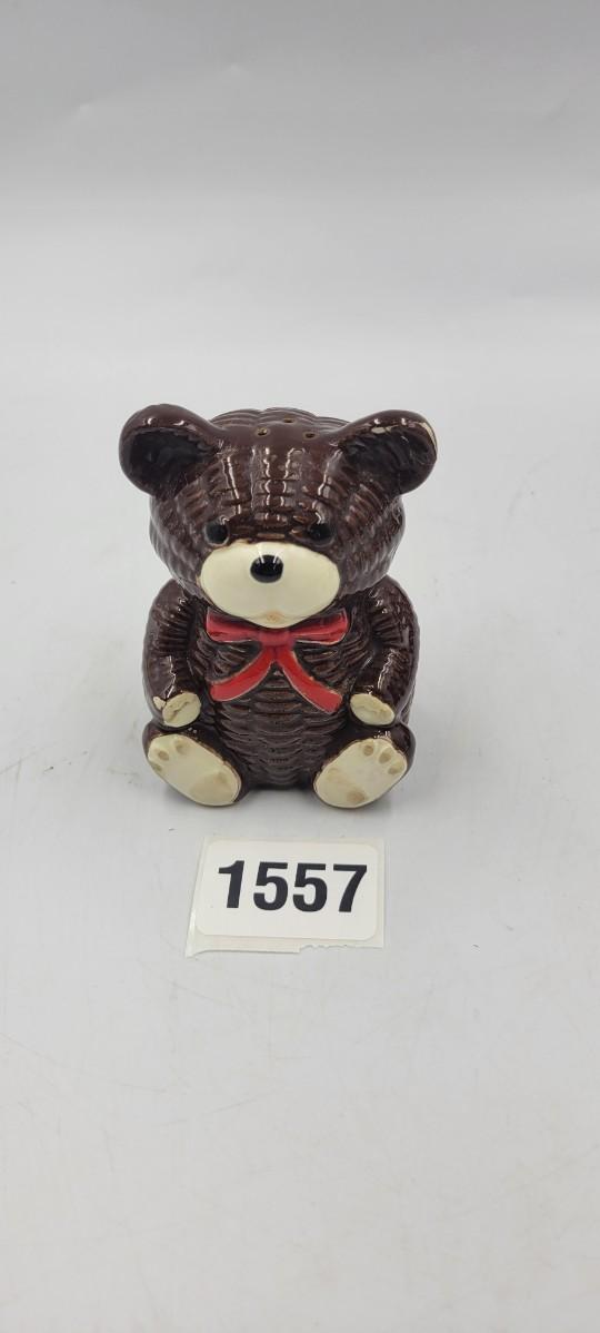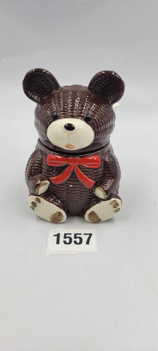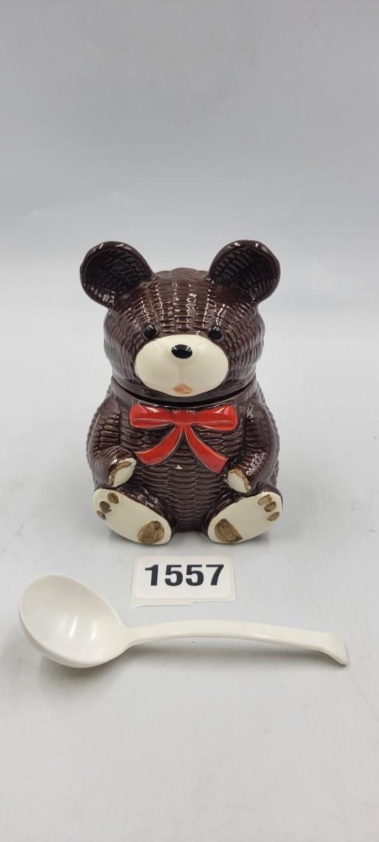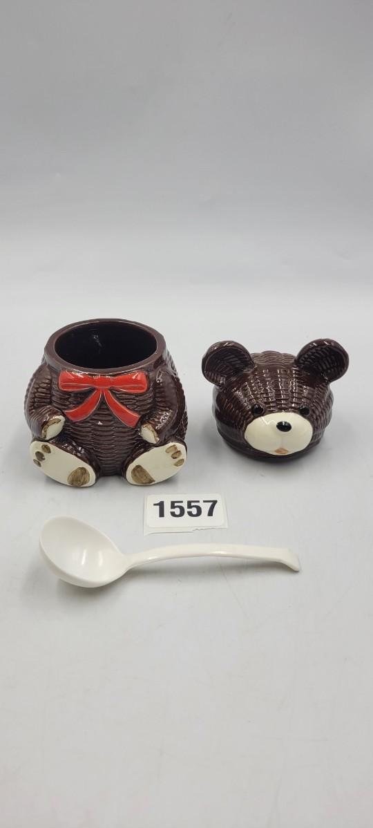 Cute set. Includes spoon. No chips, cracks, or breaks seen. S & P Shakers do have their stoppers.