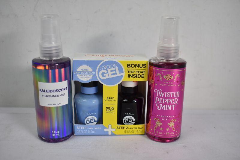 3 pc Self-Care: B&BW Fragrance Mist Twisted Peppermint & Kaleidoscope, and Sally Hansen Miracle Gel Nail Polish Set - New