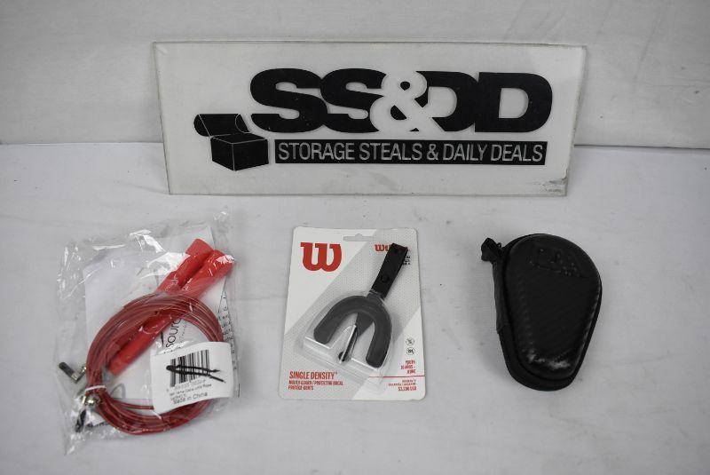 3 pc Sports: Red Jump Rope, Wilson Mouth Guard, Black Carabiner Case - New