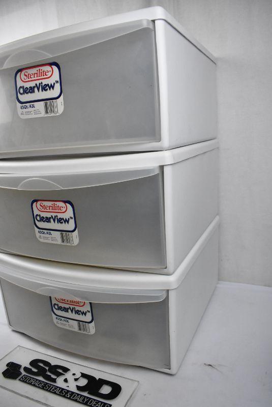 3 pc Sterilite ClearView 45qt Drawers. Stackable. 45 qts each. White & Clear