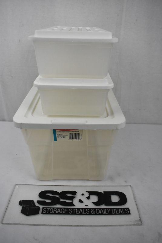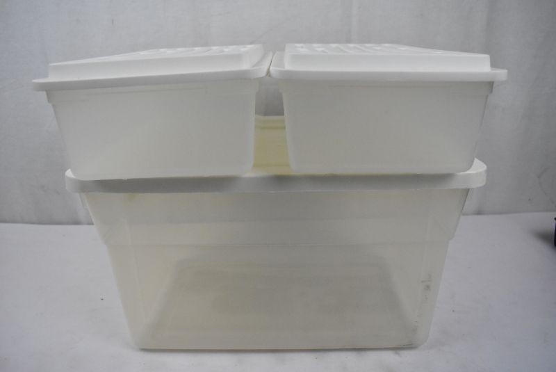 3 pc Storage Bins, White & Clear. 2 shoe box size, One 4.5 gallons