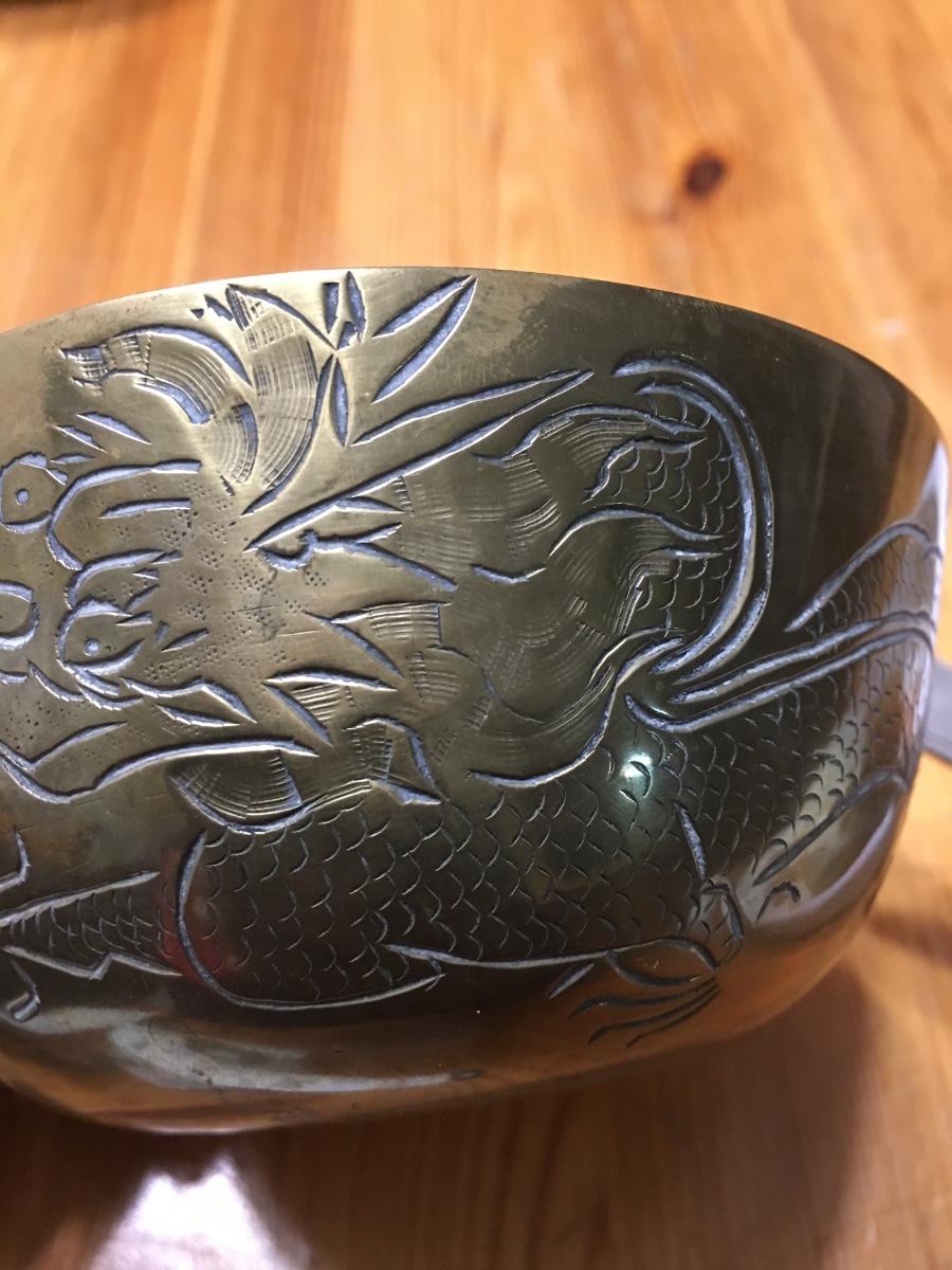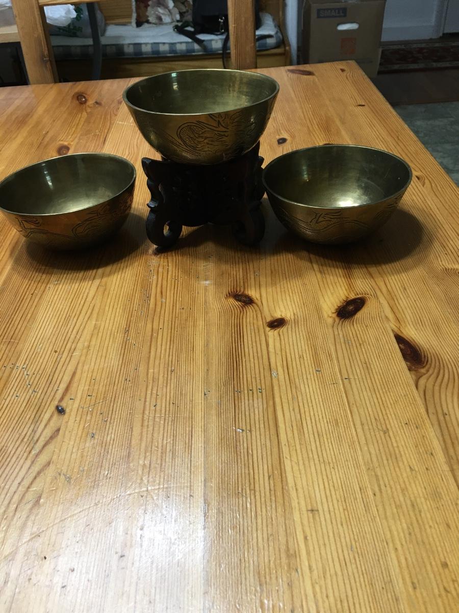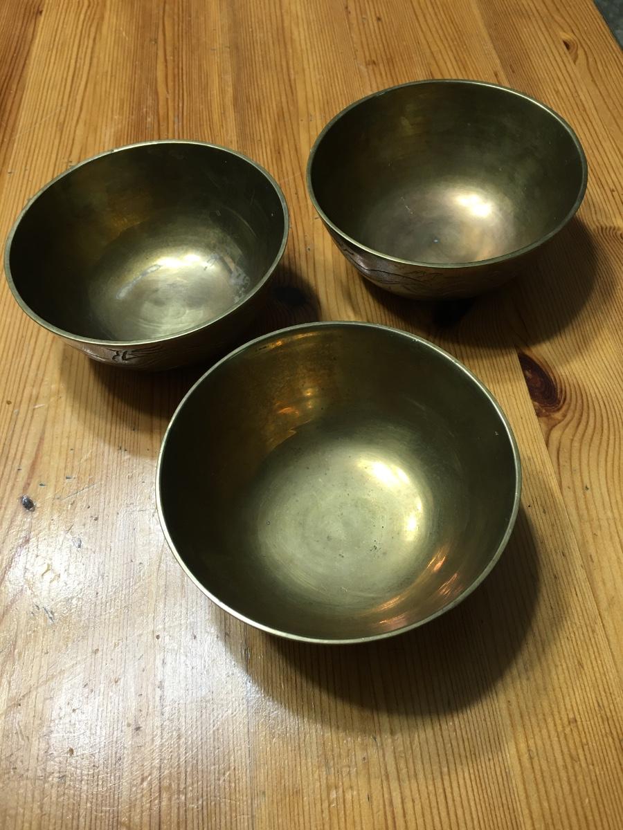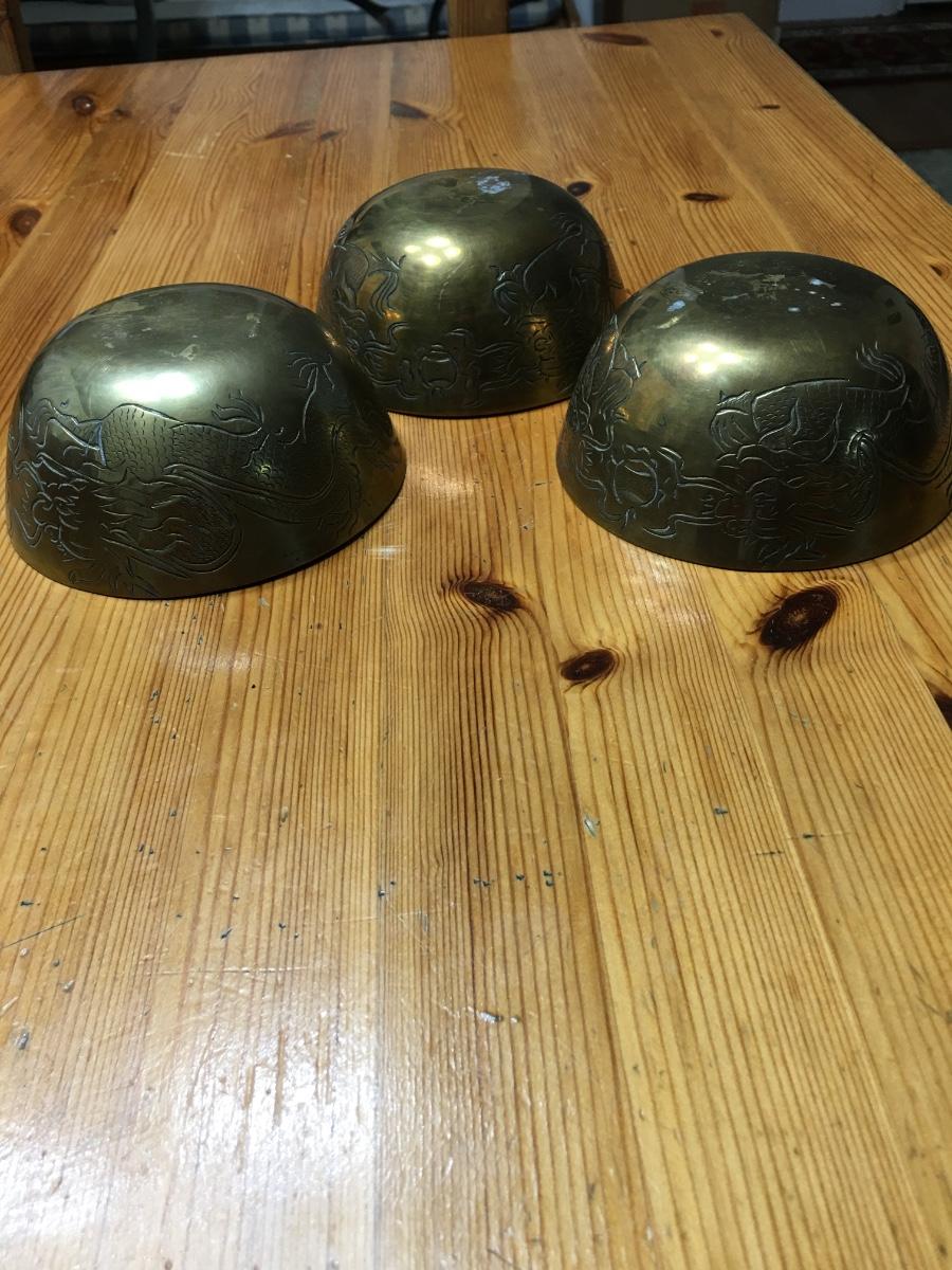 3pc Vintage brass Chinese etched dragons engraved bowls. Each bowl measures 4 1/2” in diameter and 2” tall. Bowls in good vintage condition with some oxidation as shown in photos.