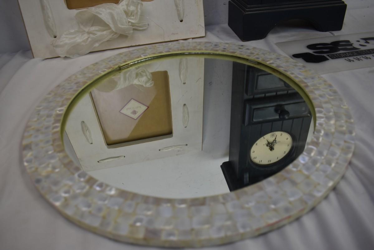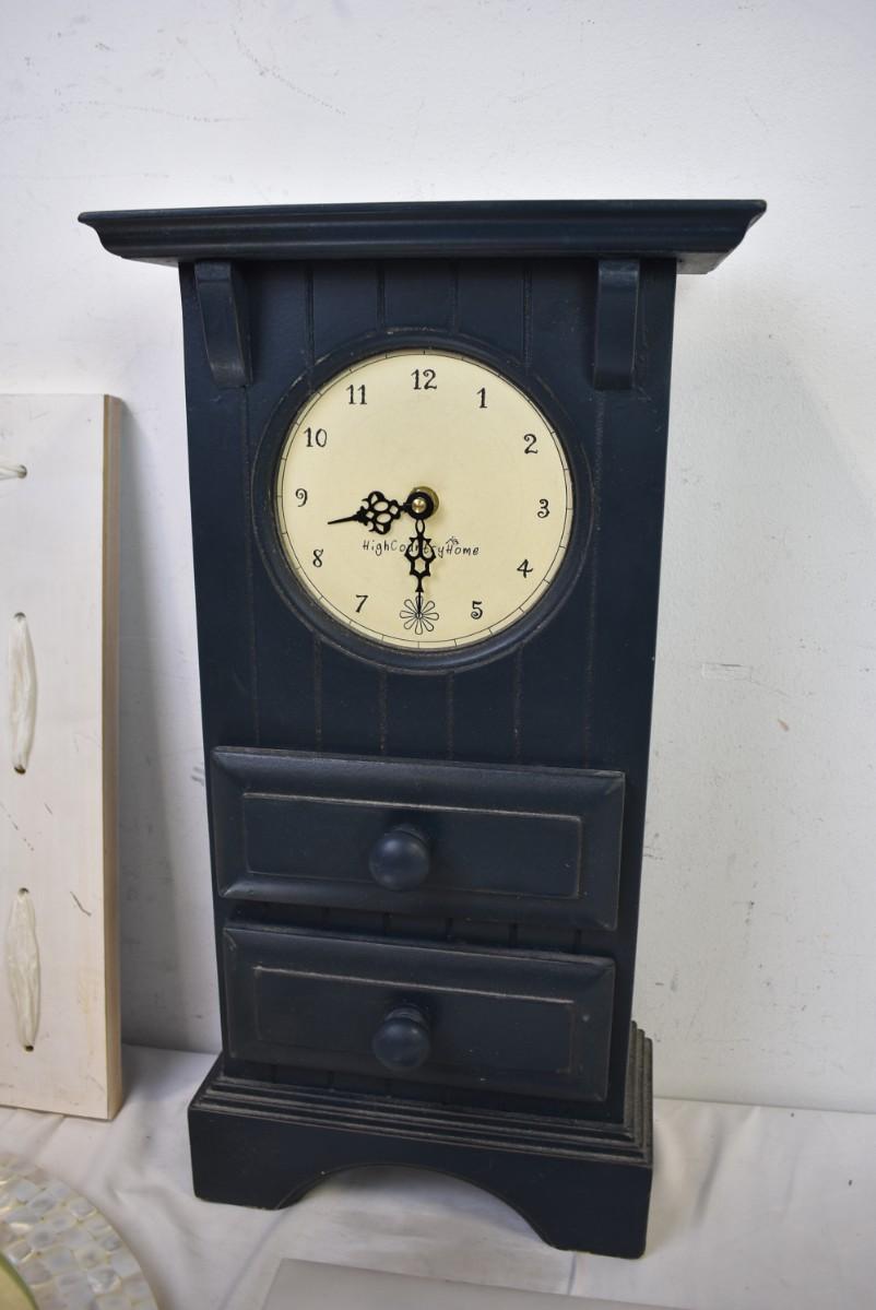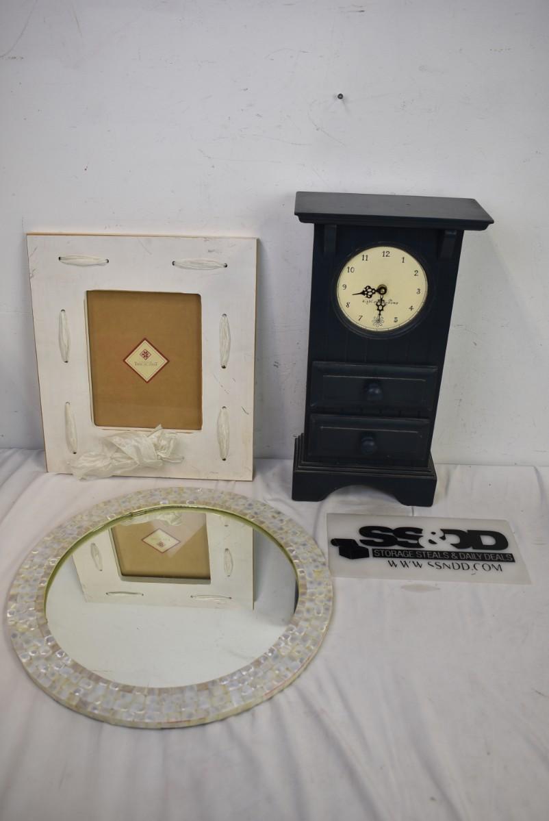 3 pc Wall Decor: Circular Glass Mirror, Wooden Clock/Shelf