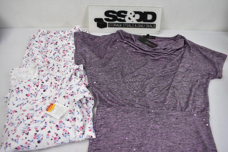 3 pc Women's Clothing Large: 2pc Floral Pajama Set & 1 Dressy Purple Shirt - New