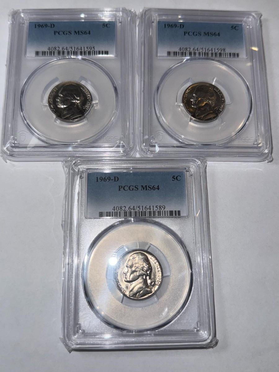 (3) PCGS CERTIFIED 1969-D MS64 CHOICE CONDITION JEFFERSON NICKEL LOT AS PICTURED. $5 DOMESTIC SHIPPING.