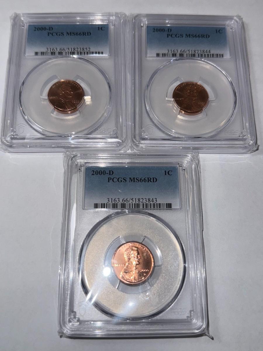 (3) PCGS CERTIFIED 2000-D MS66 RED CHOICE CONDITION LINCOLN CENT LOT AS PICTURED. $5 DOMESTIC SHIPPING.