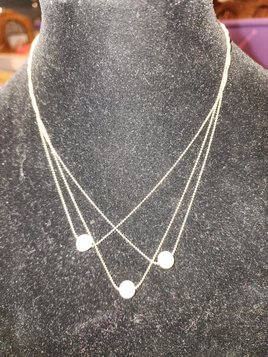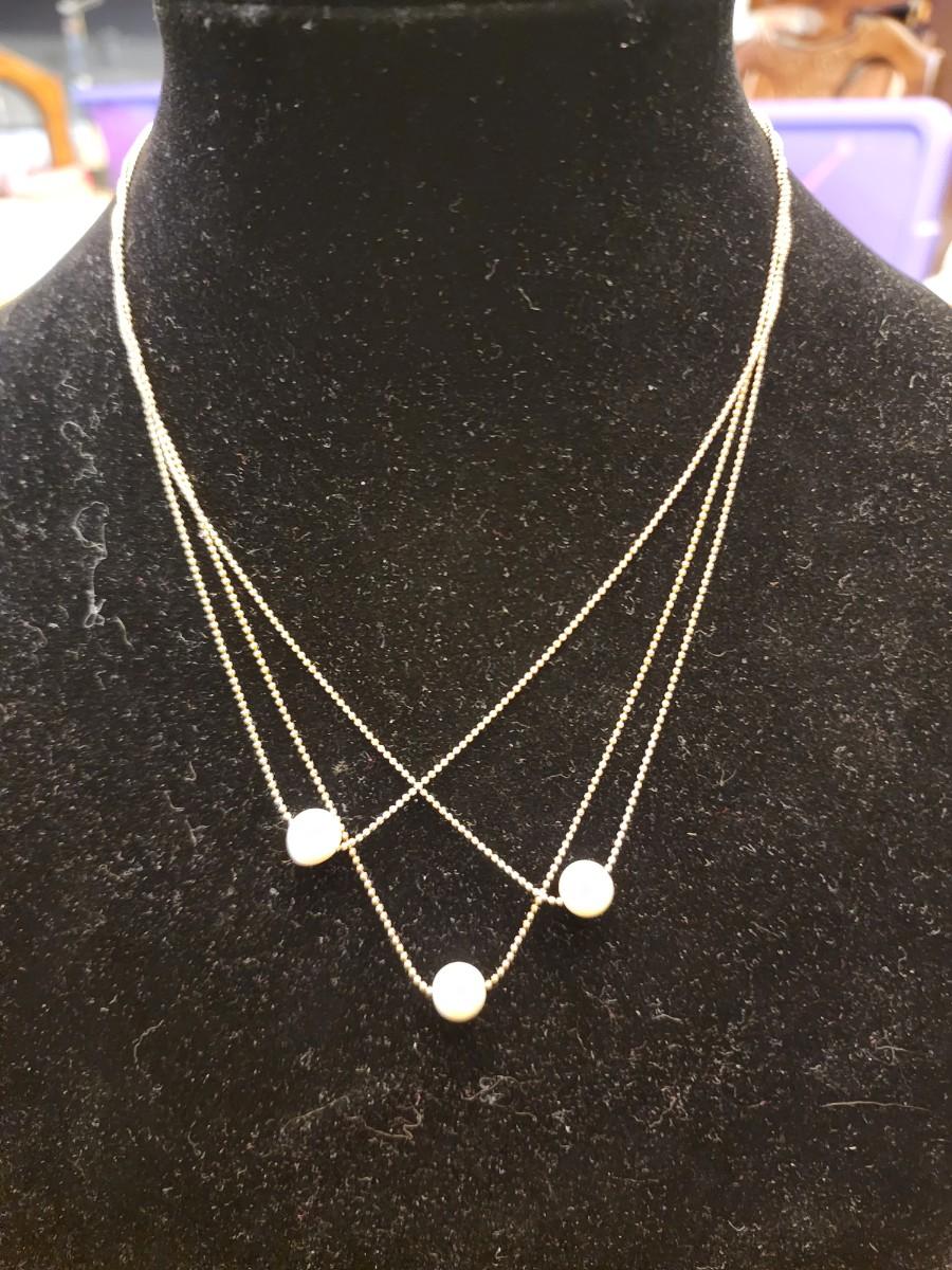 Pics throw off the color on this one. Chain is gold tone. White pearls. Delicate chain.