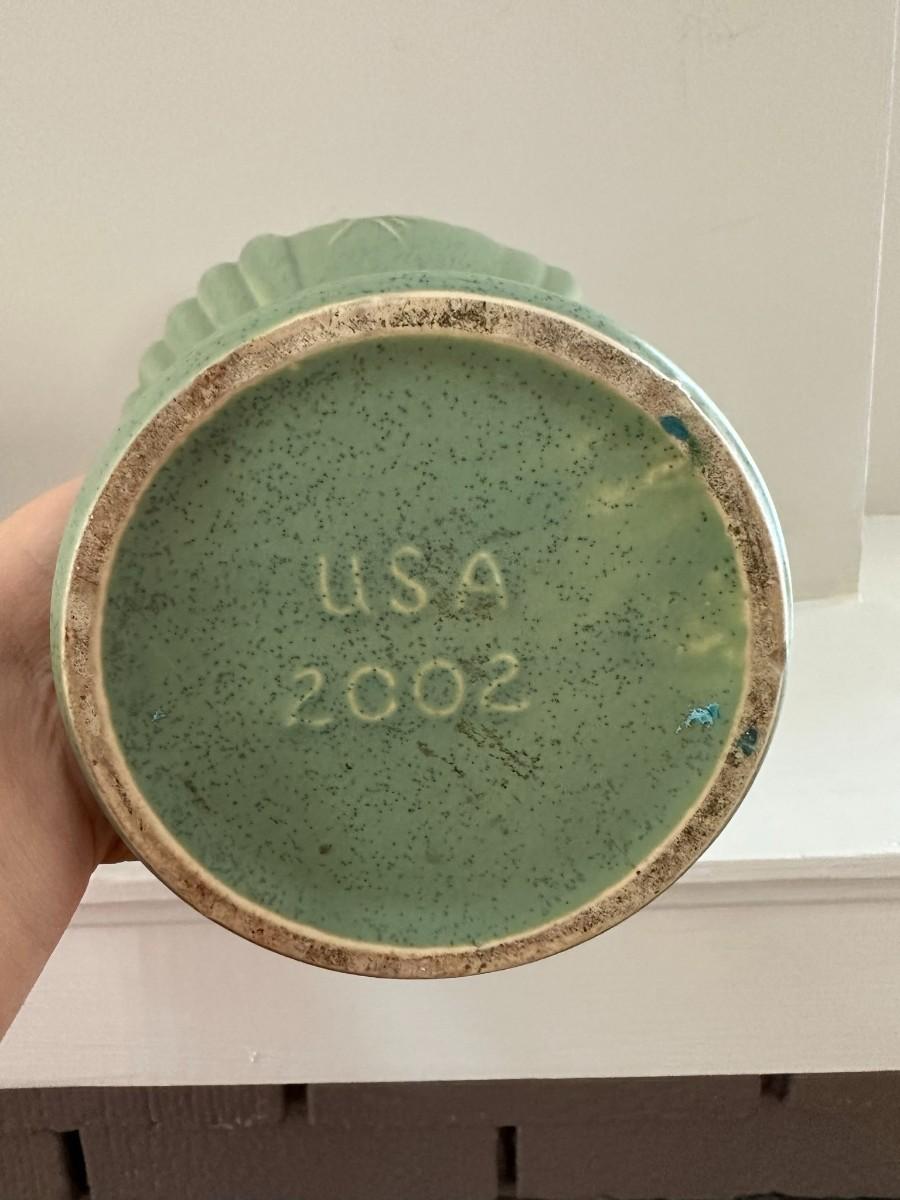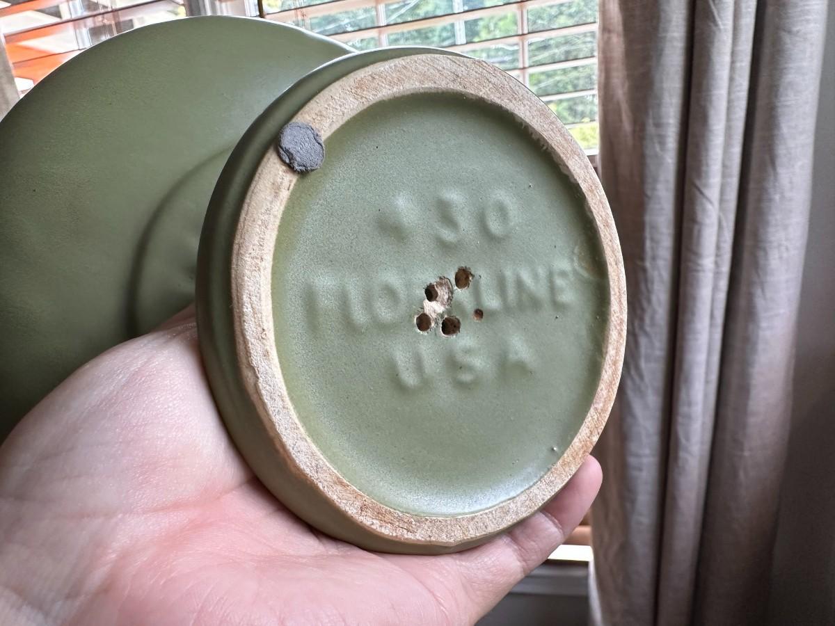 8"h x 7"w Green Dish marked USA 2002, White Dish same size with same markings. 7.7"w x 4.5"h Floraline Green dish has holes drilled for drainage.