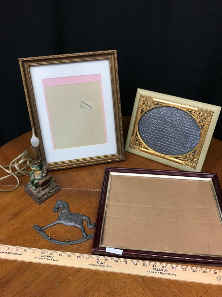 decor: 3 picture frames, cast iron horse, vintage frog lamp;