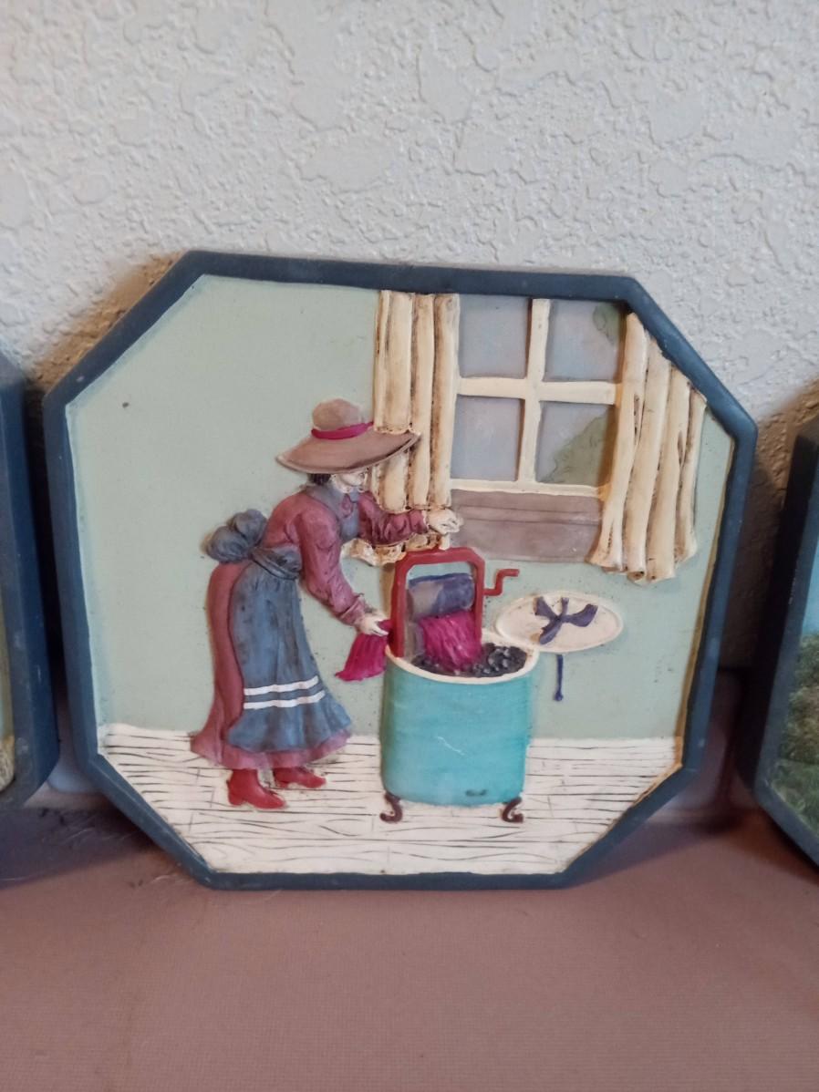 3 PICTURES WITH A LAUNDRY THEME AND A HORSESHOE TOWEL BAR