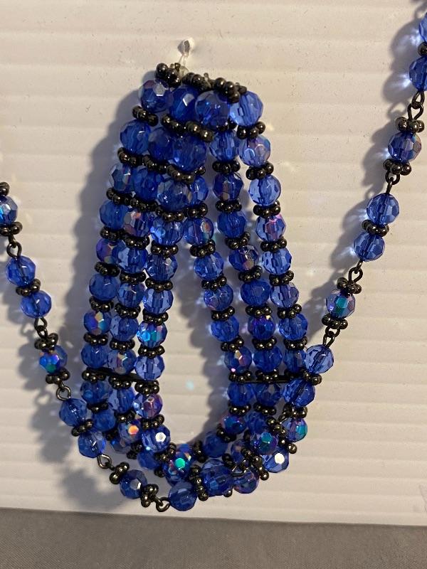 3 piece blue bead jewelry set. Plastic beads with AB effect. Earrings are for pierced ears. Bracelet is 3 strand and has stretch to it.