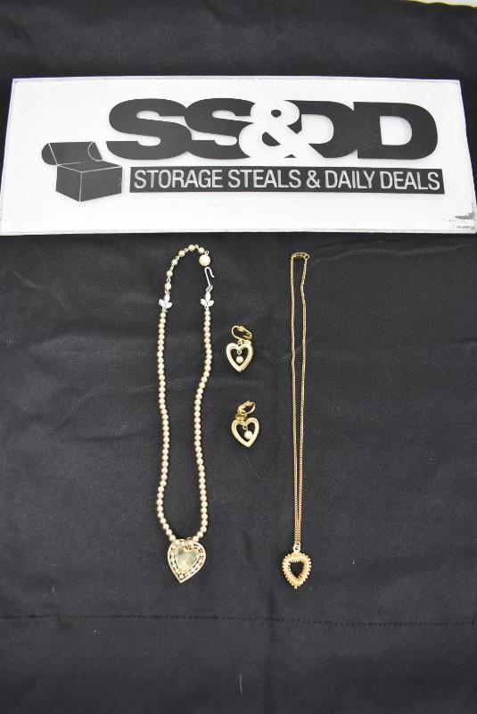 3 Piece Costume Jewelry, Hearts: 2 Necklaces & 1 pair of Clip-on Earrings - Vintage