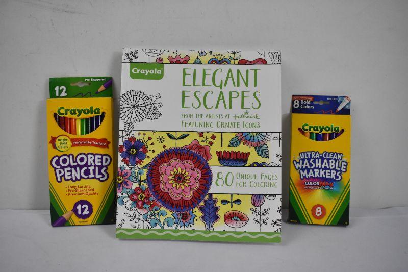 3 Piece Crayola: Elegant Escapes Coloring Pages Book, 12 Colored Pencils, & 8 Washable Markers - New