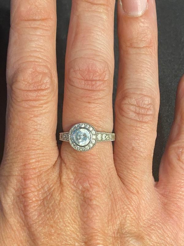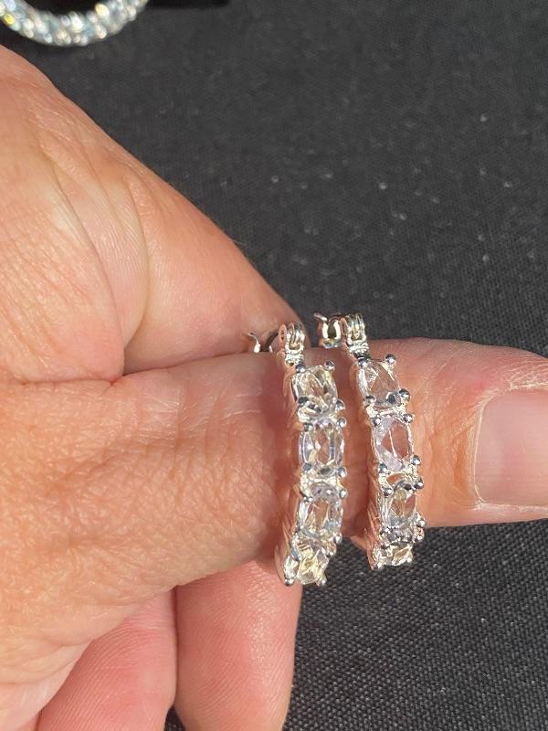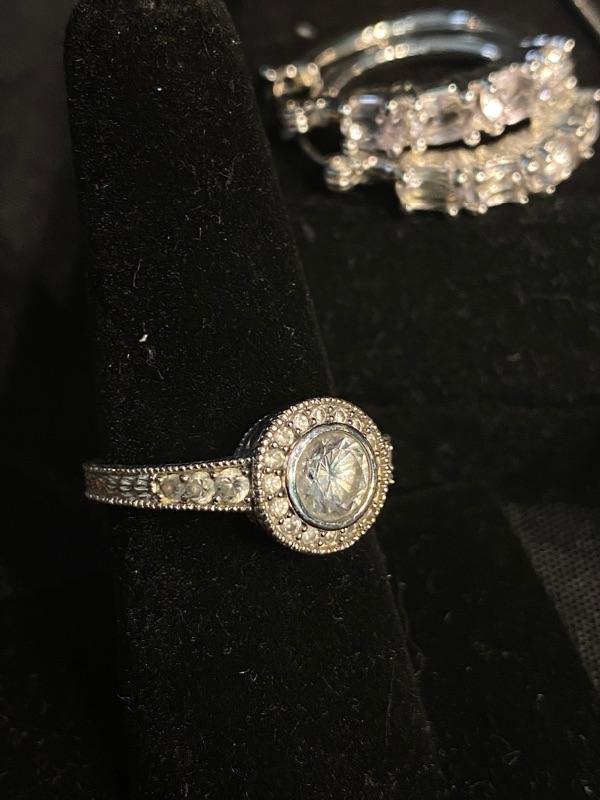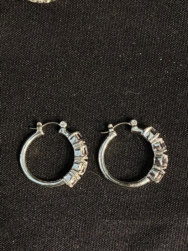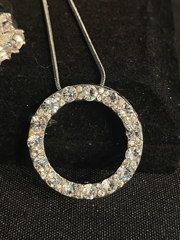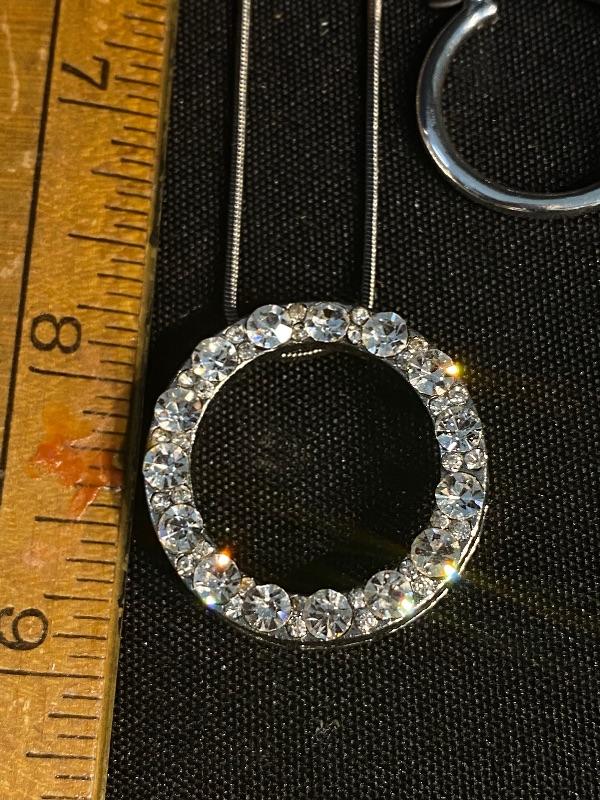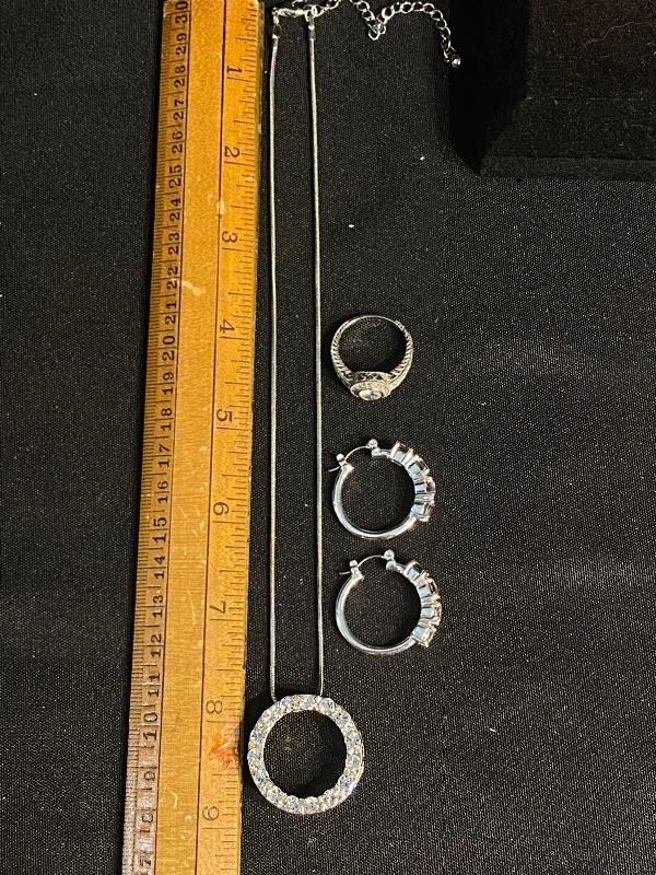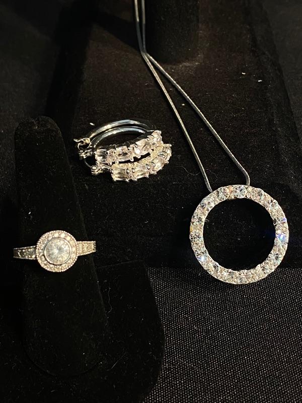 3 piece jewelry lot. Brilliant sparkle clear rhinestones. Set includes a pair of hoop earrings, for pierced ears, possibly CZ stones by the looks of them. A silvertone and rhinestone "eternity" circle pendant necklace. The ring is the only piece stamped "S925" looks to be CZ stones as well. Fits like a size 8.5 possibly a 9. All pieces are previously owned.