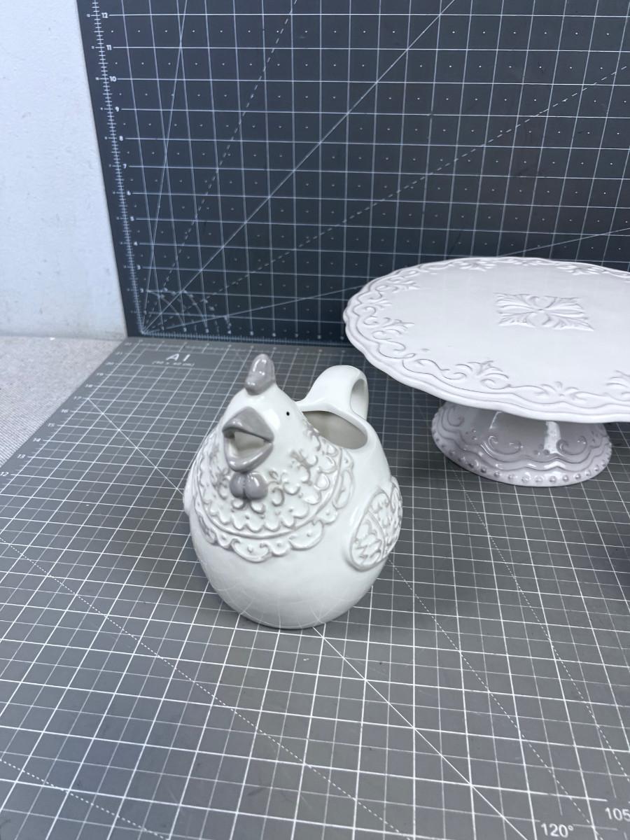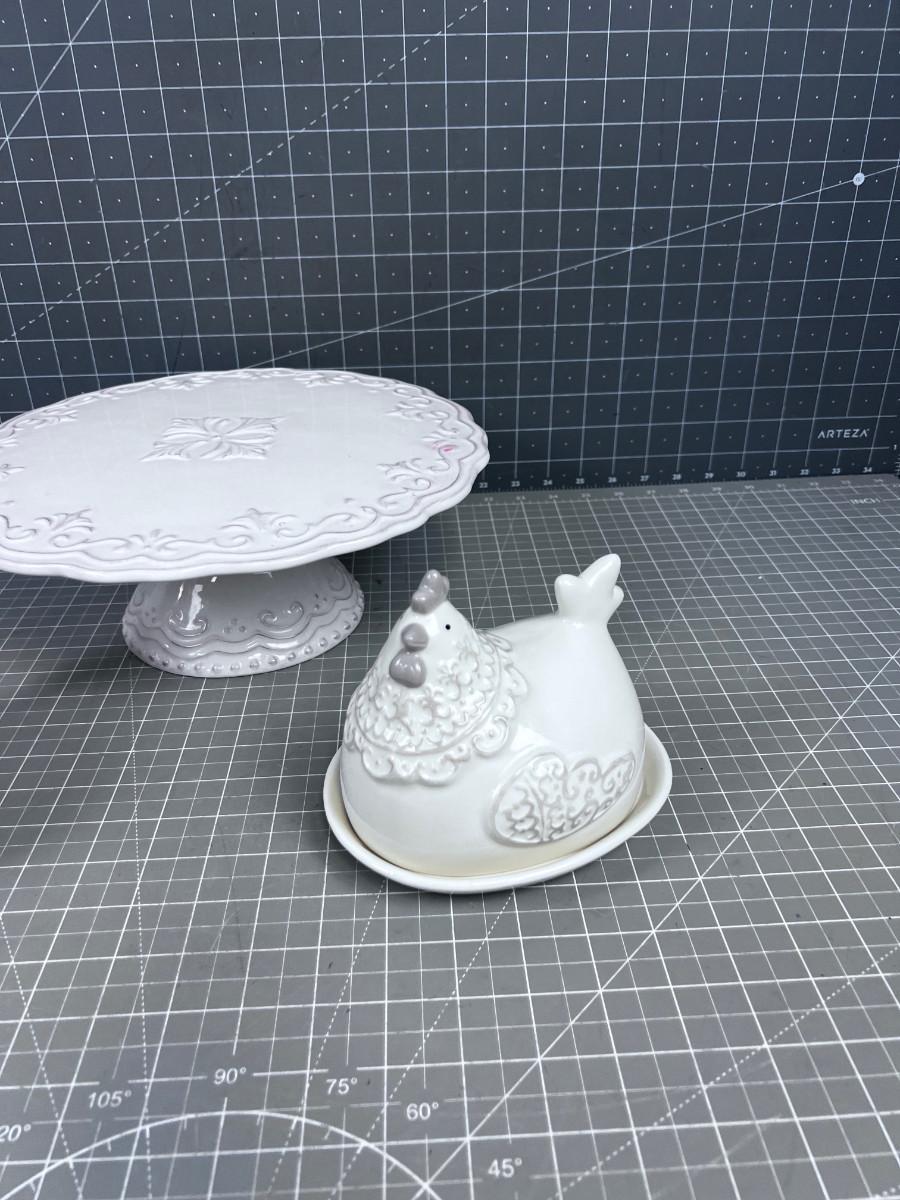 3 Piece Darling Serving: Cake Plate, Creamer and Rooster Butter Dish