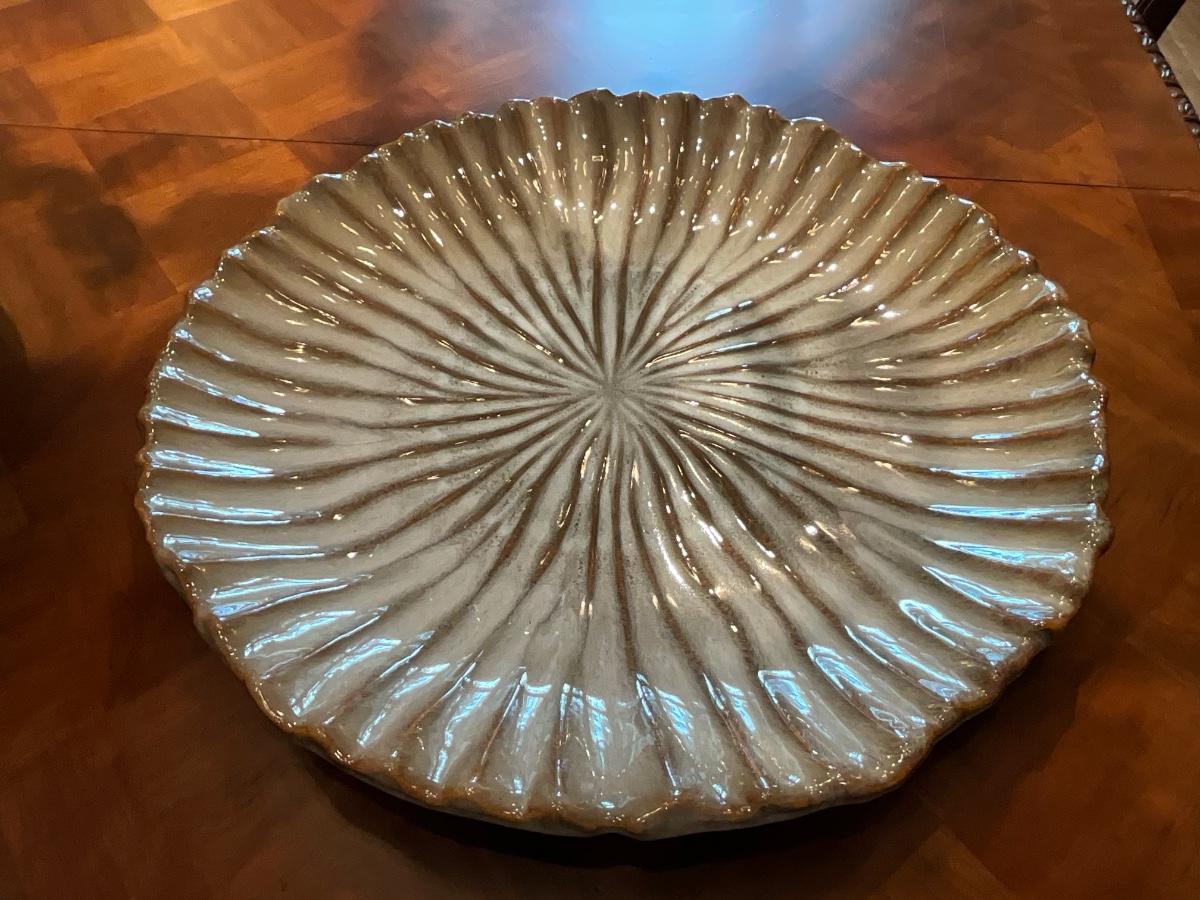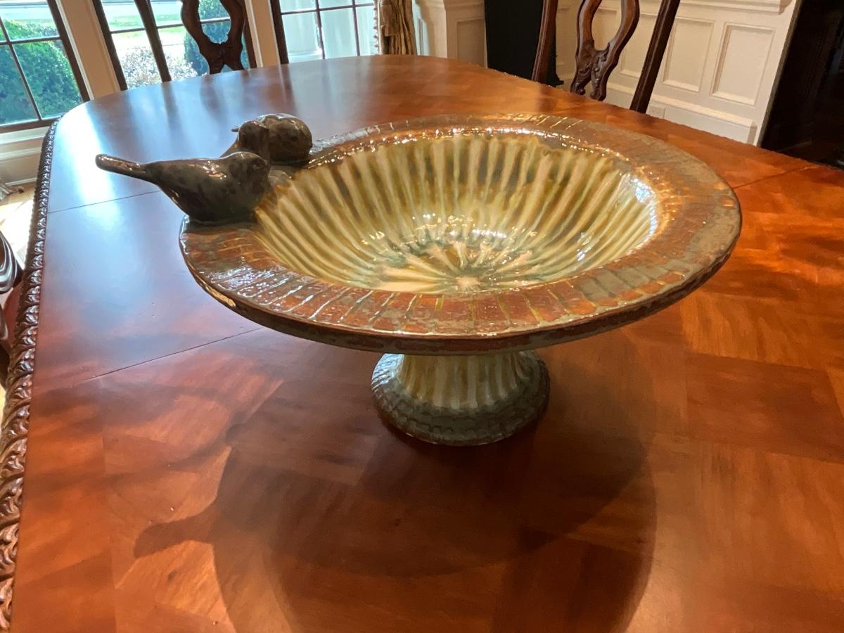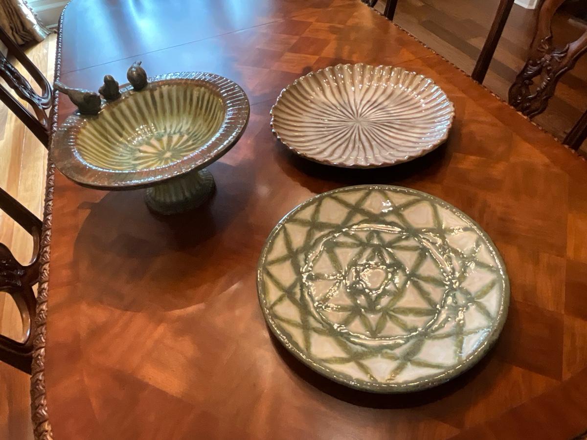 Green Decorative Plate 17”R and 2” T, Bird bowl 8” T and 16” R and Tan & Coffee color plate is 18”R and 2.5” T
